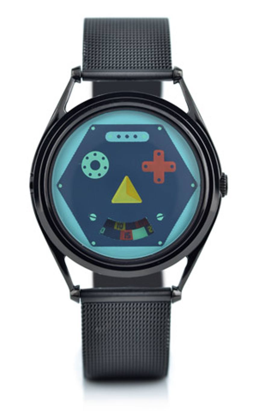 最后一款限量版 Mr. Jones Face Timers 手表是英國藝術家 Lucy Vigrass 設計的 Analogon。采用希臘語中的“比例”一詞,Analogon 是對未來的友好展望,期待智能手表的出現,甚至更多地參與連接設備(以及機器人)。表盤有一個友善的玩具般機器人的臉,“牙齒”再次提供時間。
