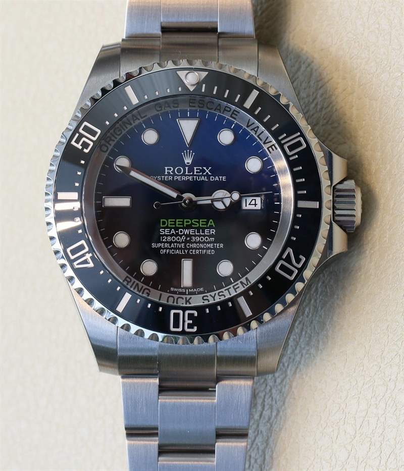 Rolex Deepsea Sea-Dweller D-Blue 是目前勞力士生產的性能最高的潛水表,也是最大的厚表殼(17.7 毫米)和寬表殼(44 毫米寬)。它配備蠔式表鏈,由 904L 鋼制成。手表的底蓋是鈦金屬的,它具有一系列有助于提供巨大防水性能的功能,例如環鎖系統和表盤上巨大的 5 毫米厚藍寶石水晶。