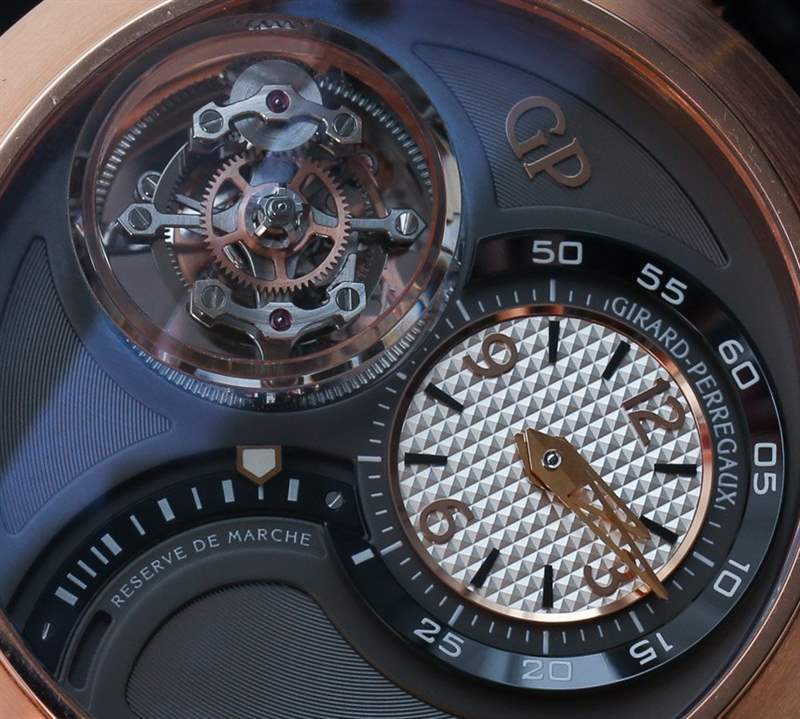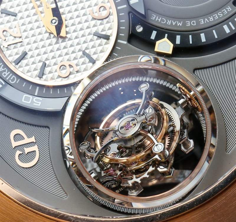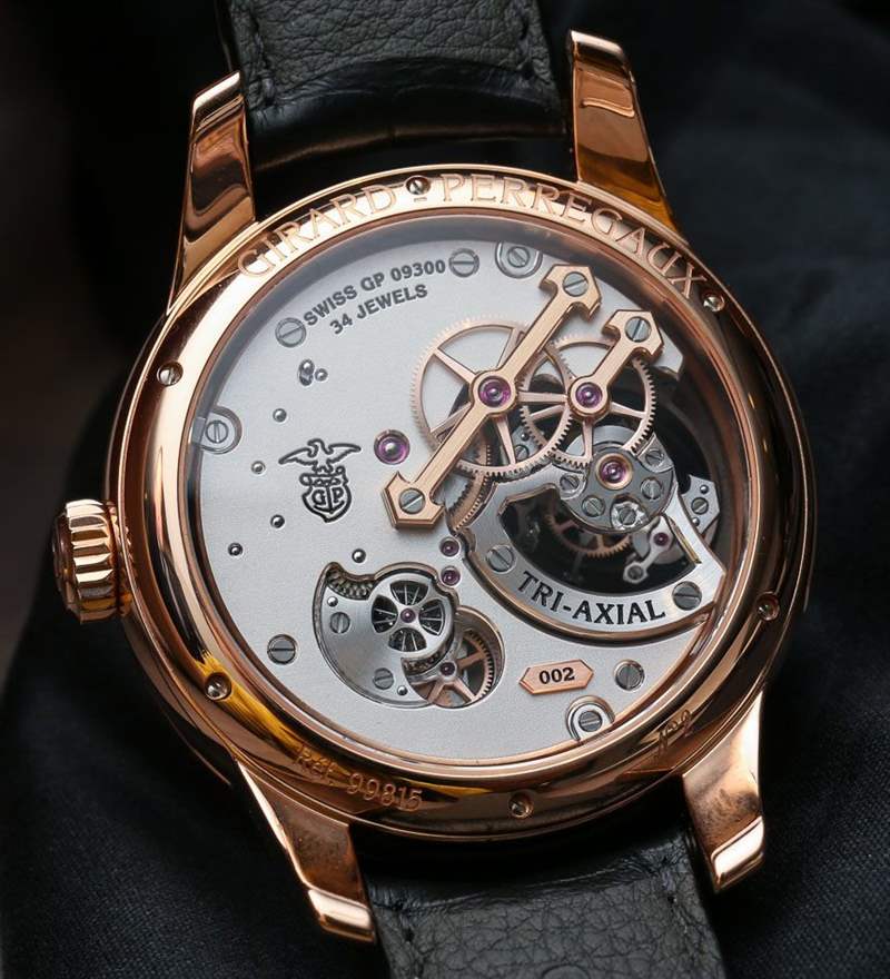 具有多個軸點的陀飛輪的生產和設計特別困難,因為陀飛輪中有陀飛輪。Girard-Perregaux 三軸陀飛輪由中央一分鐘(60 秒)陀飛輪、中間 30 秒陀飛輪和外部 2 分鐘(120 秒)陀飛輪組成。這意味著每個軸點以不同的速率旋轉,視覺效果非常令人印象深刻。還有令人難以置信的小零件密度。