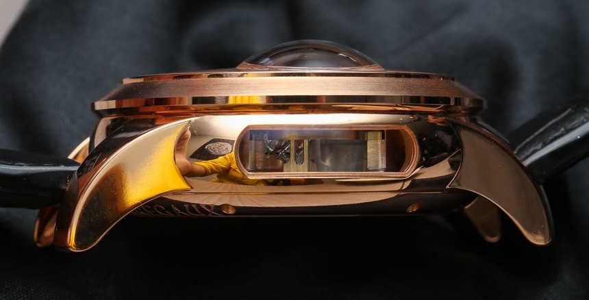 該機芯具有偏心時間表盤,以及方便的動力儲存指示器。當然,還有陀飛輪的大開窗,藍寶石水晶玻璃中有一個氣泡為其騰出空間。如今,水晶中的這種“氣泡”越來越容易被接受。也許真力時首先在最初的零重力陀飛輪中引入了它們,后來變成了Christophe Colomb 系列。其他品牌,如海瑞溫斯頓,也在水晶中使用氣泡來為復雜的陀飛輪復雜功能騰出空間。