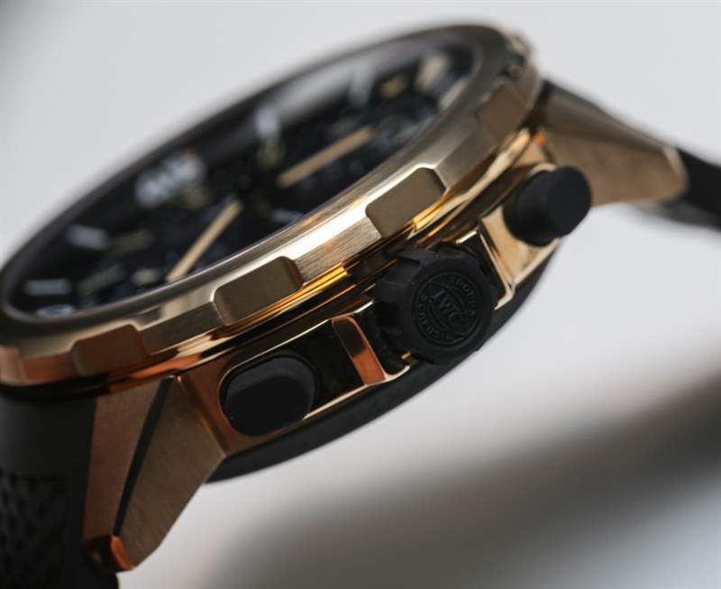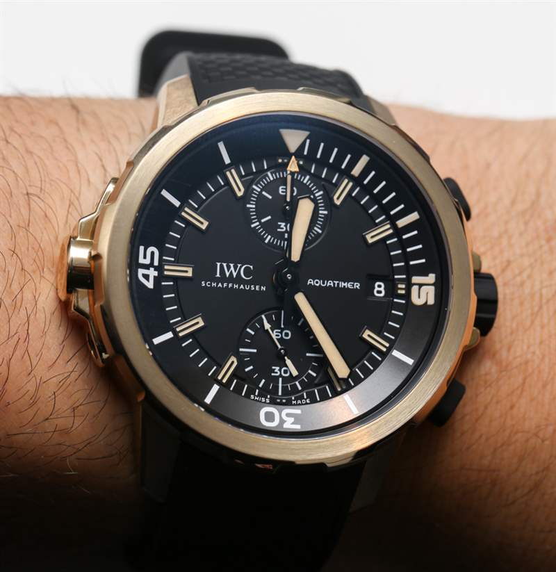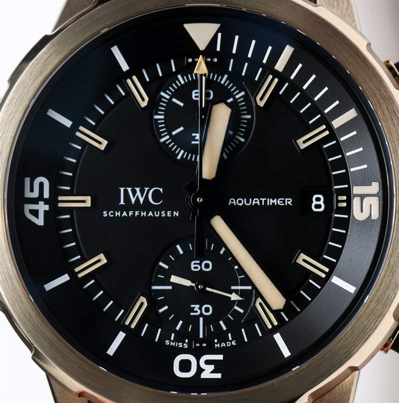 據 IWC 萬國表稱,他們使用了一種非常堅固的青銅合金,使其更堅硬,與皮膚接觸也更安全。這意味著它的鋁和銅的比例很高,這使它呈現出溫暖的顏色。這應該轉化為更艱難的情況,持續時間更長。我相信青銅比鋼更容易劃傷,但人們不會因為這個原因選擇它——他們喜歡它的顏色,他們喜歡它看起來有點像金(但價格不一樣),而且它有點獨特。IWC 萬國表選擇用這種材料生產他們的許多新款海洋時計手表中的一款,坦率地說,我認為它與黑色橡膠和其他黑色調混合非常漂亮。