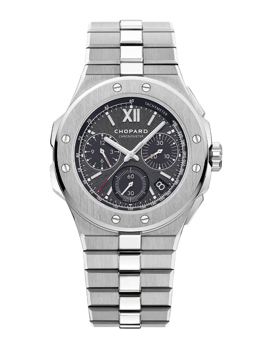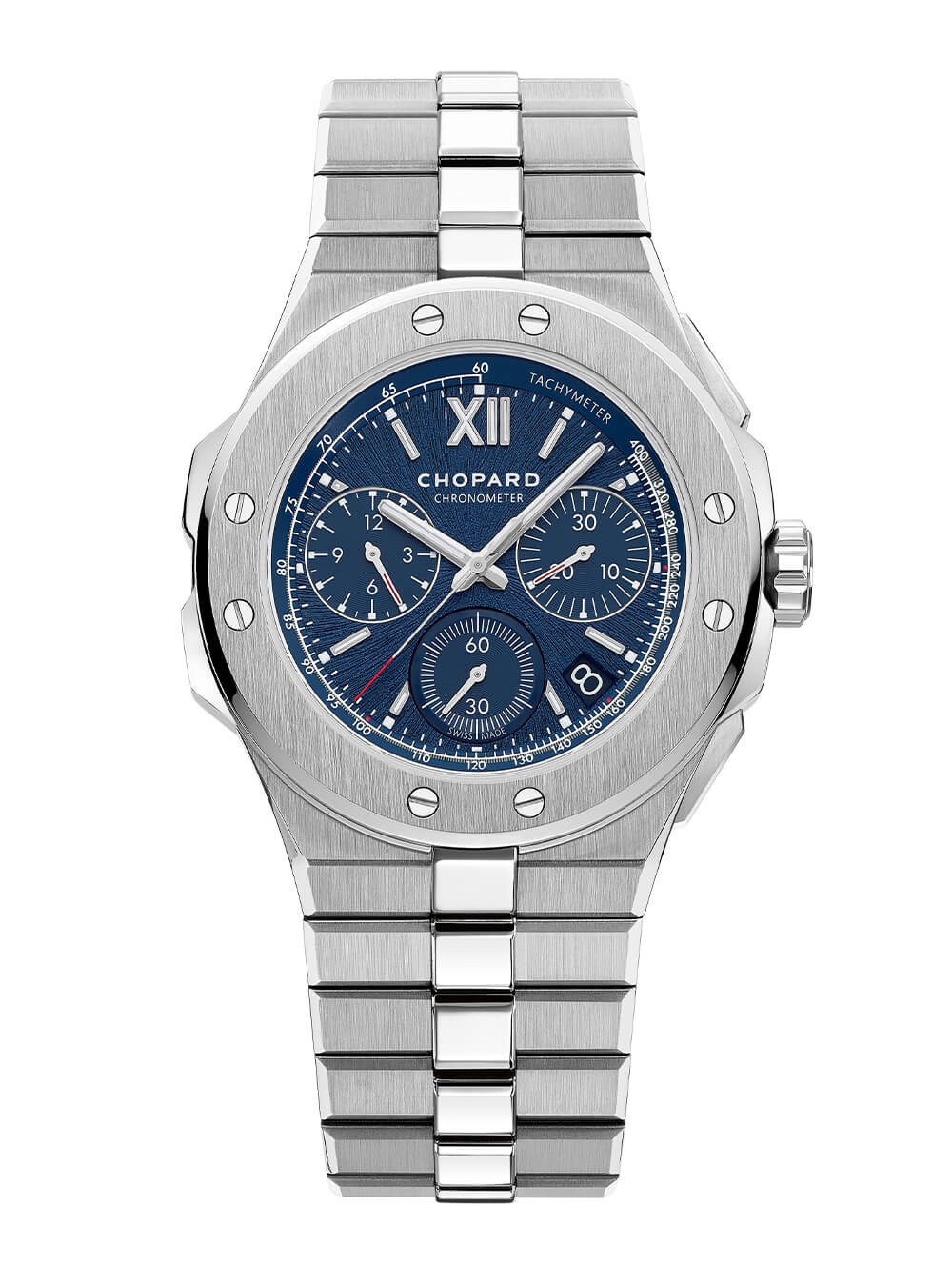 Alpine Eagle XL Chrono 增加了一個飛返計時碼表,該計時碼表由 Chopard 完全內部 03.05-C COSC 認證的自動導柱輪計時碼表機芯提供,該機芯擁有 60 小時的動力儲存,并已在 Chopard 的運動型 Mille Miglia 計時碼表中證明了自己。