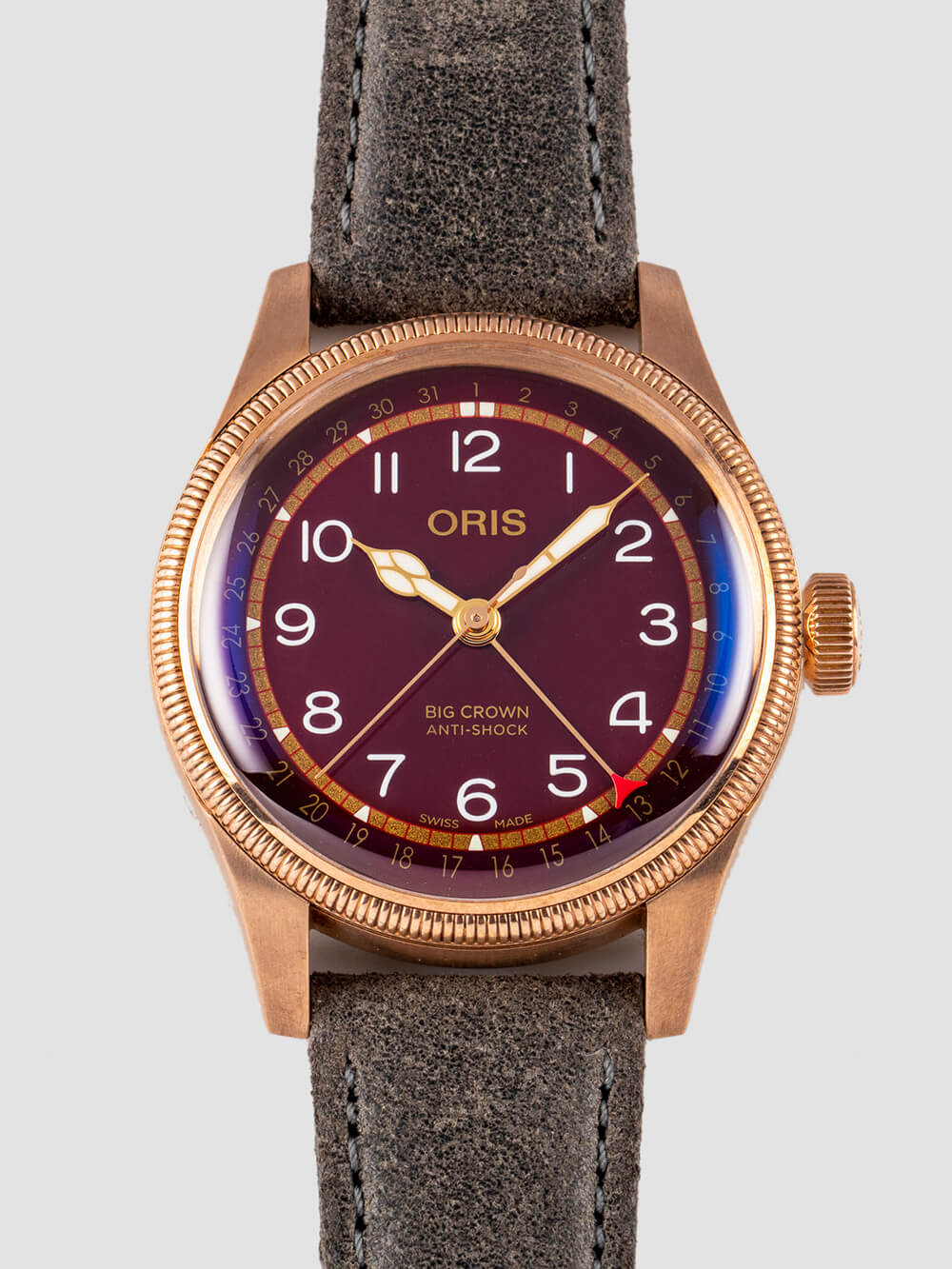 在這里,Fratello 采用了以前只出現在鋼上的紅色,將它與青銅表殼相結合,然后顏色匹配指針日期功能。這不是一個調整,而是 Oris 已有產品的雅致組合。我喜歡它。