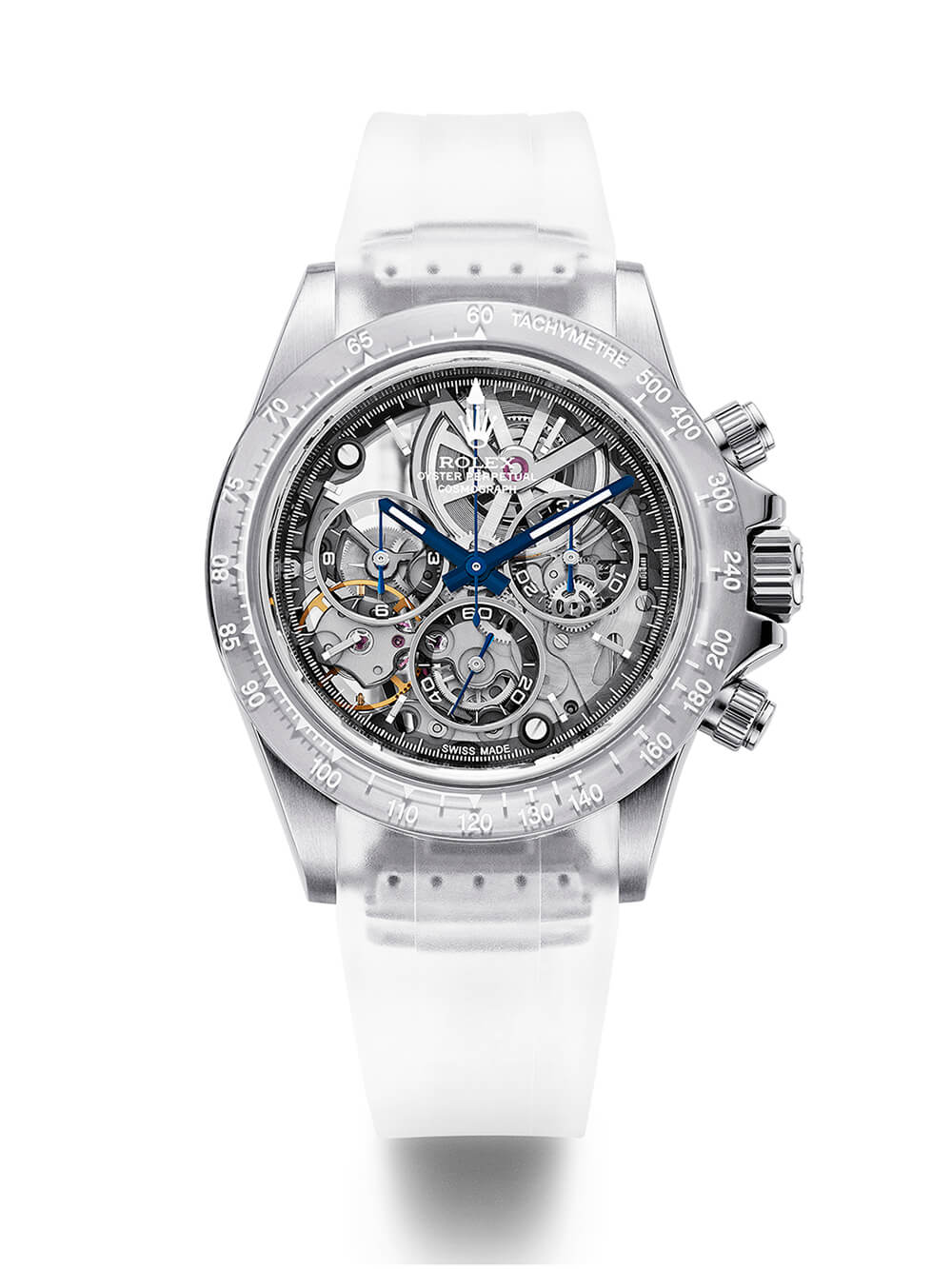 表殼在緞面不銹鋼材質上更加精簡,但原始的 Daytona 按鈕被替換為 MK “Millerighe”版本,外觀和感覺更加堅固,非常適合山區。整件事情都在透明橡膠表帶上完成,以使冰冷的外觀更加圓潤。