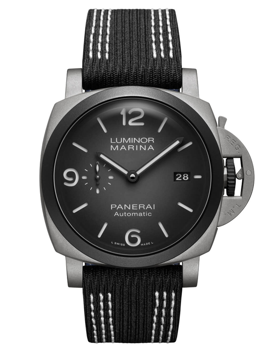 表殼/表盤:直徑 44 毫米,噴砂 DMLS 鈦金屬,帶有漸變效果的黑色表盤,帶有白色阿拉伯數字和時標的三明治結構 Super-LumiNovaTM 帶綠色熒光