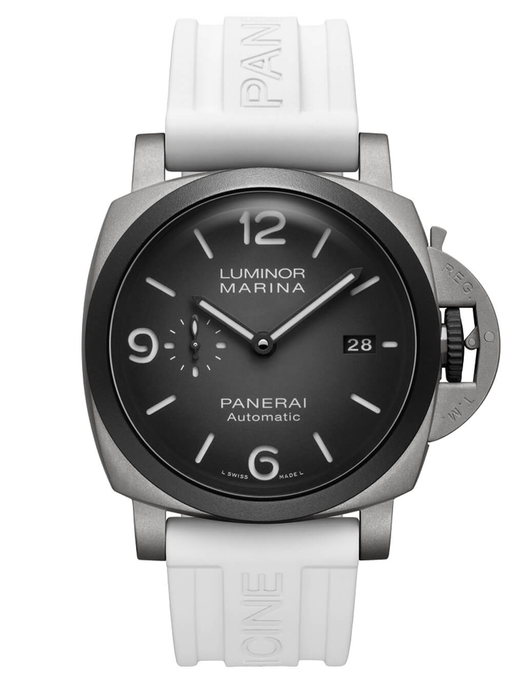表帶:再生 PET,黑色帶白色縫線和梯形針鈦金屬表扣,DLC涂層,白色橡膠表帶,熒光“Officine Panerai”個性化