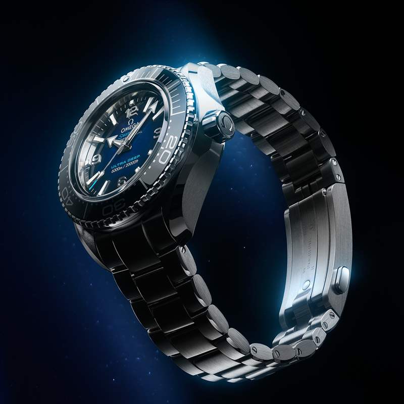 想深入漆黑的海洋深處探索海底的神秘,那么海洋宇宙腕表45.5毫米至臻天文臺 Ultra Deep 款堪稱專業潛水表的最頂端產品。這款腕表的表殼為45.5毫米,并不顯得很大,佩戴腕上頗為舒適。采用堅固耐用的 O-MEGASTEEL 材質打造,拋光黑色陶瓷表圈飾有 Liquidmetal 潛水刻度。透過凸起的拱型藍寶石玻璃表鏡,可以看到亮漆表盤呈現從藍色到黑色的漸變效果。最讓行家欣喜的是,在產品研發過程中,歐米茄在真實的海洋環境中對這款腕表進行測試,其防水深度高達6,000米(20,000英尺),并通過了國際標準化組織(ISO) 6425:2018有關飽和潛水表的認證,堪稱專業潛水表之王。