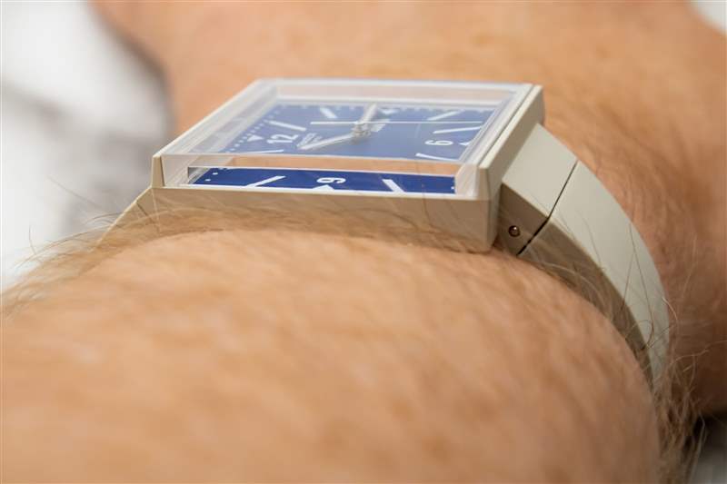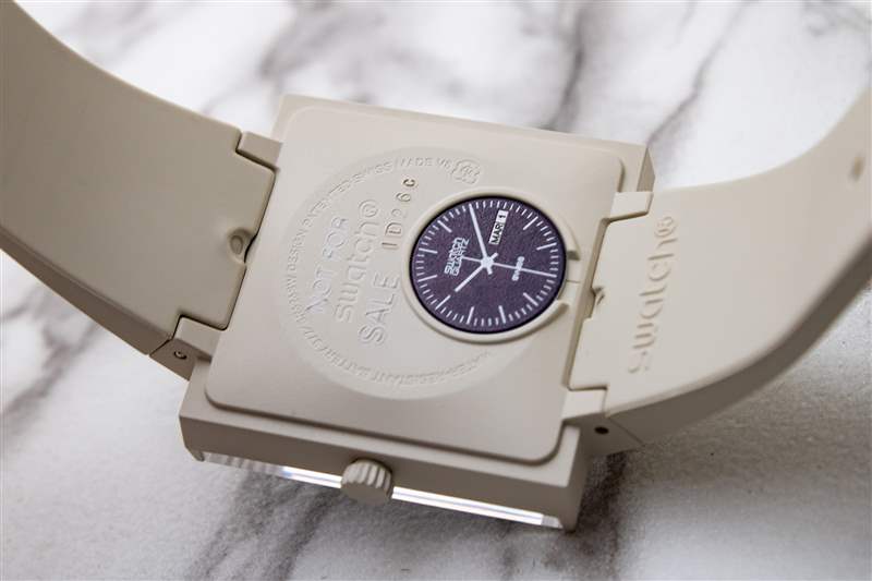 Swatch What If? 的啞光生物陶瓷表殼寬 33 毫米?線條足夠小,幾乎適合任何手腕,但尖銳的棱角形狀有助于它們顯著脫穎而出。這些手機殼有多種顏色可供選擇,包括黑色、中灰色、森林綠和奶油米色(我們的測試樣品有黑色和米色),這些手機殼概念簡單,但執行起來卻很微妙。從字面上看,主箱體只是一個正方形。這里沒有嘗試塑造輪廓或刻面,只有四四方方的線條和清晰的角度。盡管如此,表殼還是很輕、很舒適,戴在手腕上很舒服。表耳是這里的一個主要因素,其下垂的帶帽形狀自然地貼合手腕的形狀,同時又不影響純粹的棱角設計語言。此外,這種經常被詆毀的生物陶瓷材料在這一應用中大放異彩,具有令人信服的絲滑、近乎失重的感覺和輕微紋理的單色啞光外觀,成功地傳達了該品牌所追求的 80 年代時代的風格(特別是米色表殼看起來像是可以舉起來的)來自當時制造原始 Apple Macintosh 臺式電腦的同一條生產線)。這個案例最大的風格亮點在概念上也非常簡單。生物玻璃水晶不是簡單地位于表殼頂部,而是環繞在 3 點鐘和 9 點鐘位置,幾乎延伸至表殼側面的中間位置。這不僅使得表盤可以從近90度的角度觀看,而且還為整個腕表賦予了一種迷人的空靈、開放的氣質。斯沃琪 (Swatch) 進一步向圓形表款致敬,而圓形表款實際上是從 What If? 的底蓋開始的。線。每個型號的電池蓋都以令人印象深刻的細節描繪了 80 年代早期 Swatch 表盤原版之一。雖然這些表背可能是厚顏無恥的自我指涉,但它們遠非耐用,Swatch 對該系列的防水深度僅為 20 米。廣告留言廣告信息結束