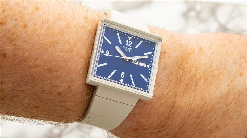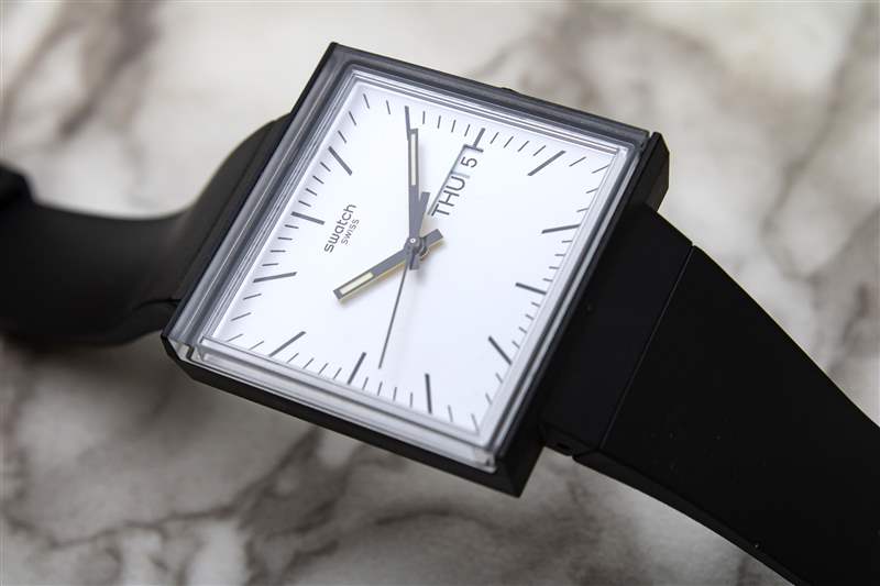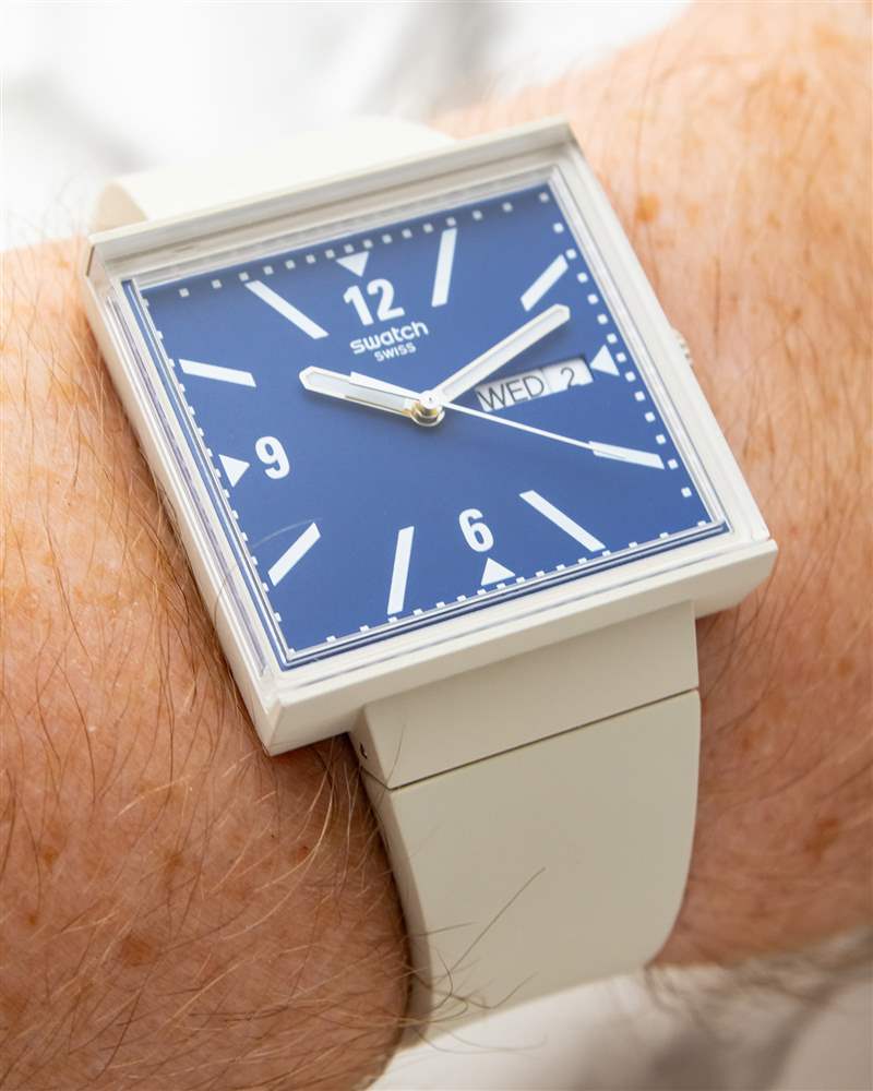 Swatch What If 中的每個型號?系列提供自己的表盤布局。黑色表款的整體設計超簡約,采用啞光白色底座,簡單的黑色印刷小時和分鐘線條,以及夜光黑色指揮棒式聽筒。相比之下,米色外殼的模型給整個過程帶來了更多的個性。寶藍色表盤表面仍然非常平坦和啞光,但印刷的白色阿拉伯數字和傾斜索引的混合增加了布局的復雜性。外部分鐘刻度的厚實印刷方塊以圖形方式展示了方形表盤計時的獨特怪癖及其擠壓和拉伸的位置,使表盤在手腕上具有近乎現代藝術風格的感覺。一組拋光的直劍手完成了布局,