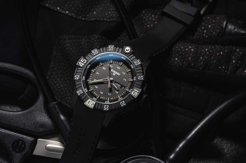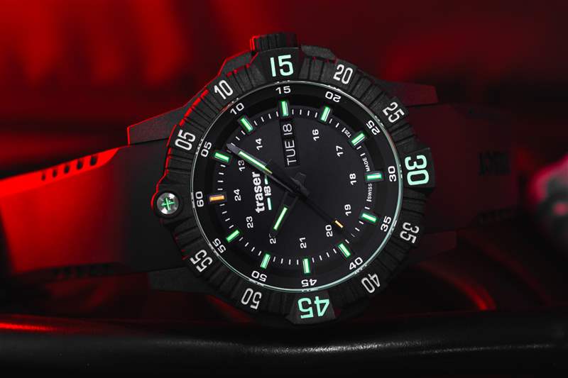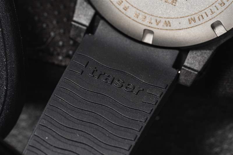 Traser P99 Q Tactical 是一款不小的手表,但戴在我 6.5 英寸的手腕上并不笨重(如上圖所示)。盡管尺寸較大,但混合表殼結(jié)構(gòu)和黑色碳纖維強化外殼的纖薄特性使其佩戴起來異常舒適。搭配的橡膠表帶重 100 克,也使其成為其他類似尺寸手表的輕巧替代品。這種較大的尺寸還可以防止它滑到襯衫或夾克的袖口下面,與大多數(shù)手表相反,這在緊急醫(yī)療領域是首選。在大多數(shù)情況下,戴著臟手套將袖帶向后滑動來檢查時間并不理想。然而,帶有棱紋的表圈很容易被任何類型或任何污垢量的手套抓住。雙向 60 次點擊邊框是一個令人愉悅的功能補充。雖然傳統(tǒng)的潛水表圈是單向的,但現(xiàn)場使用設備的多功能性和適應性受到贊賞。如果我要改變邊框的一件事,那就是可以選擇更換其他刻度以滿足任務要求。