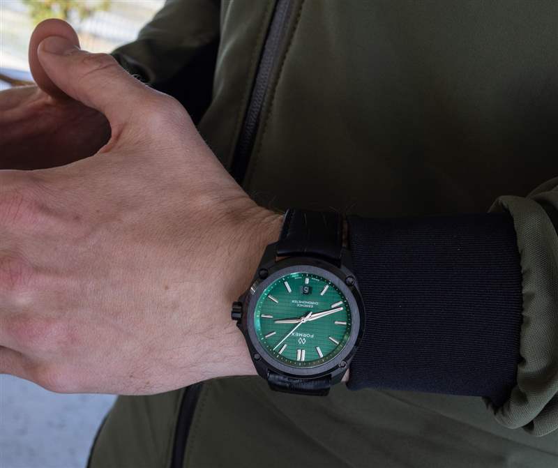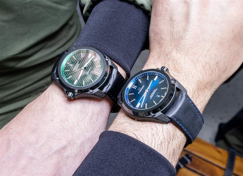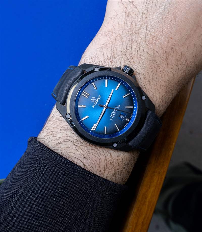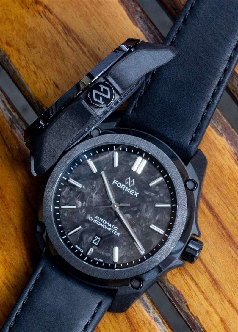 Leggera 手表的外殼由專有的黑色碳混合物制成,而表圈則由拋光的黑色陶瓷制成。表盤上方是 AR 涂層藍寶石水晶,表殼防水深度達 100 米。這些輕型手表(不含表帶)的重量對于 43 毫米寬的型號僅為 50 克,對于 41 毫米寬的型號為 40 克。除了表殼直徑和表耳到表耳的距離(49 毫米對 46.5 毫米),Essence Leggera 的兩個版本是相同的,包括 11 毫米厚的表殼尺寸。Formex 想要生產兩個版本的 Essence Leggera 只是為了滿足更廣泛的消費者需求,因為外殼尺寸偏好隨品味和解剖結構而變化。