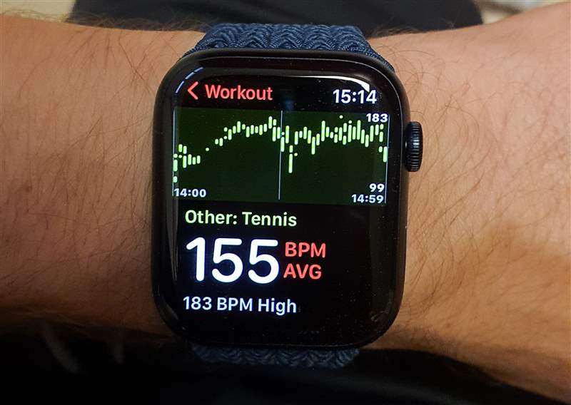 第一件事。我將支持 Ariel 關于 Apple Watch 耐用性的反饋。我手腕上的變體是 Apple Watch Series 7 GPS + Cellular,帶有 45 毫米午夜鋁制表殼。這意味著它是更柔軟、更便宜的版本——一旦你匹配了 GPS 和蜂窩連接以及編織環,它比不銹鋼版本便宜約 220 美元……但我不介意。我正在關注鈦金屬版本,但它只在 Apple.com 上列出,在我拿到我的時候沒有交付,所以鋁對我來說是一個加號,因為考慮到 3,我想要一些輕便的東西我會在 Apple Watch Series 7 上進行 -4 次每周鍛煉/網球訓練。