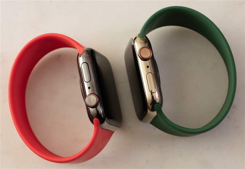 Midnight 鋁制表殼的表現非常好,包括它的 Ion-X 玻璃顯示屏——只有更昂貴的不銹鋼版本(就像 Ariel 收到的那個)在前面有藍寶石水晶。所以,再一次,我的 Apple Watch Series 7 可能是所有系列中最不耐磨的,它有涂層的鋁制表殼和玻璃顯示屏——在佩戴它進行鍛煉幾周后,我清楚地記得有一次我真的很驚訝它看起來多么嶄新。當然,您的里程可能會有所不同,但我確實記得我在佩戴這款入門級“AW7”幾周后仍保持原始狀態時感到由衷的驚訝。