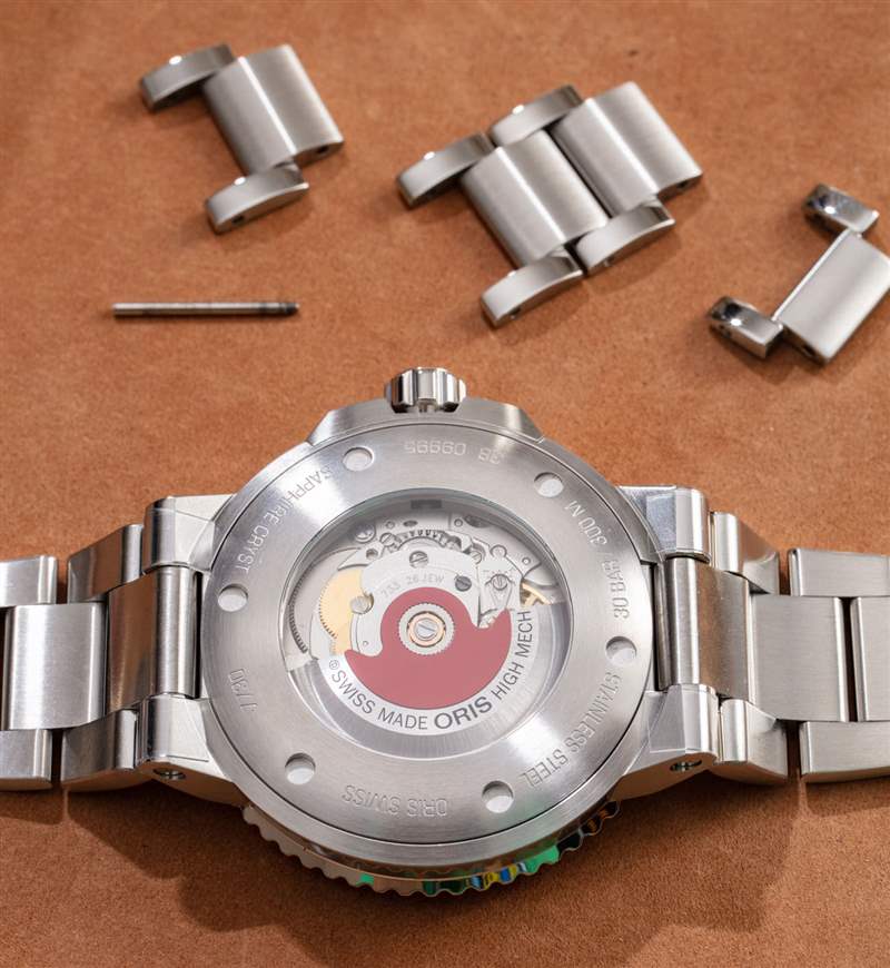 在表殼的背面,您可以通過用于手表正面的礦物玻璃窗藍寶石看到機芯)。能夠查看運動在潛水表上不太常見,因此這是一個不錯的功能。Oris 將機械機芯稱為 Oris 733 機芯。它是瑞士制造的 Sellita SW200-1 自動機芯(或多或少是 ETA 2824-2 的克隆)。機芯并沒有真正的裝飾,但它確實有標志性的紅色 Oris 自動轉子。機芯以 4Hz 頻率運作,動力儲存 38 小時。機芯沒有問題,但這與我寧愿去支付 SW200 一樣昂貴。我更希望 Oris 使用稍微精細的 SW300,或者至少為他們用于 Aquis Date 的 SW200 機芯提供一些裝飾。照這樣說,