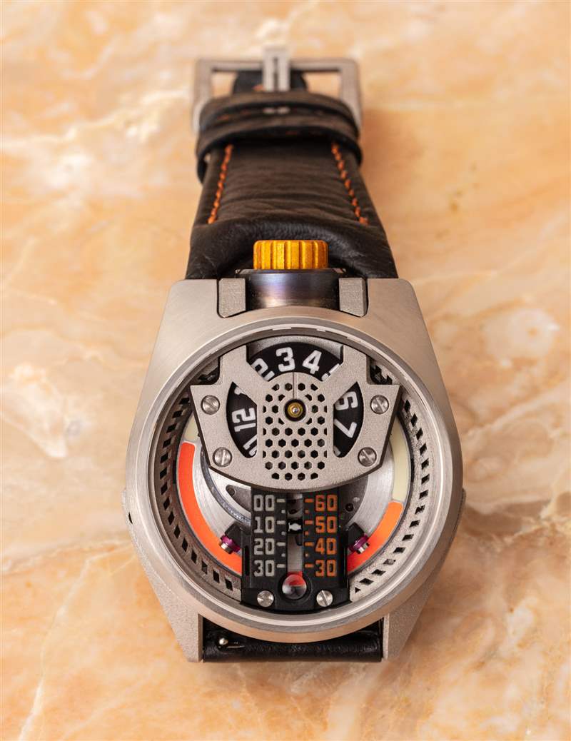 這個戒指有兩個功能。首先,它的外圍裝有一個 ForgeGlow 夜光涂層指示器,當通過位于 6 點鐘位置的小型放大鏡觀察時,該指示器可用作 AM 或 PM 指示器。在此上方是線性分針,它指示半小時向上,另一半小時向下。它的運動是由一種橢圓形的凸輪操作的。最重要的是一個跳時盤。