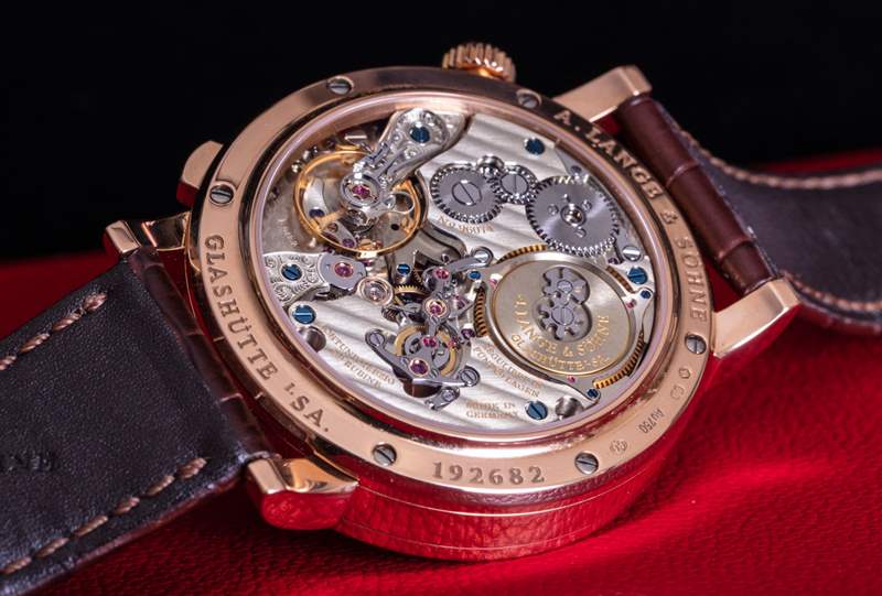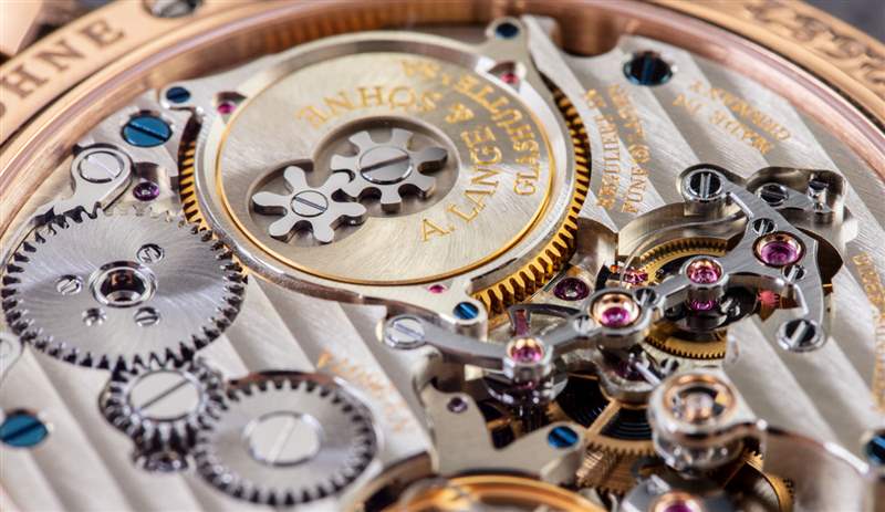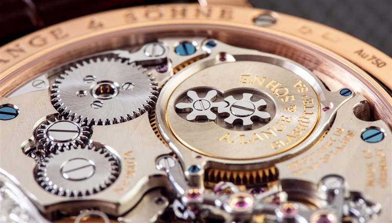 由 528 個(gè)零件制成的 L043.2 機(jī)芯在視覺上令人驚嘆。與其他朗格 (A. Lange & Sohne) 機(jī)芯一樣,該機(jī)構(gòu)不僅完全由手工裝飾,而且一旦機(jī)芯最初組裝,就會(huì)被拆開、檢查,然后重新組裝。我在上面提到了該機(jī)制如何包括恒力擒縱系統(tǒng)。這樣做的目的是確保從為手表提供動(dòng)力的主發(fā)條盒為運(yùn)行報(bào)時(shí)系統(tǒng)的齒輪系提供更加一致的動(dòng)力量。通過表殼后部可以直觀地看到恒力機(jī)制在發(fā)揮作用,因?yàn)樗鼤?huì)產(chǎn)生動(dòng)力,然后以一致的脈沖將動(dòng)力傳遞給齒輪系。該機(jī)芯由德國(guó)銀制成(隨著時(shí)間的推移會(huì)形成迷人的銅綠),并使用大量高端功能,