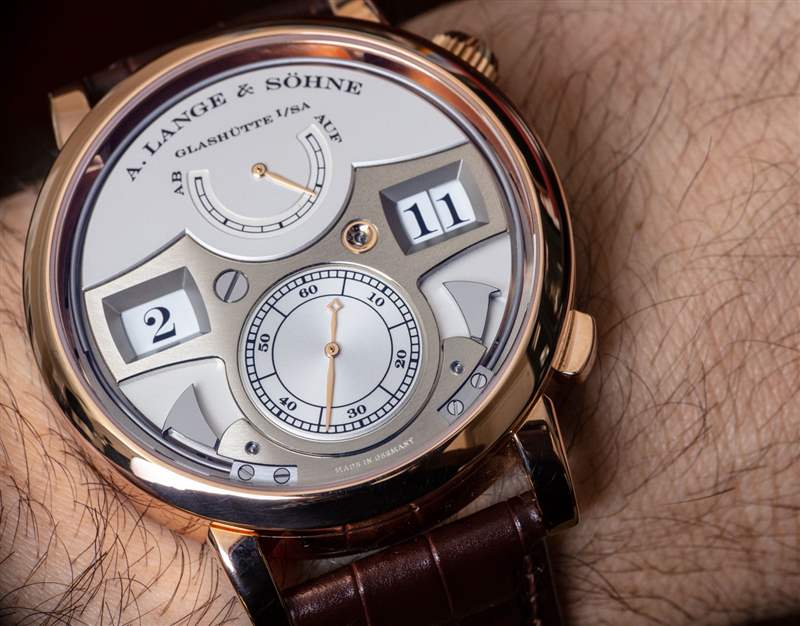 表盤上用于時(shí)間的兩個(gè)數(shù)字表盤由用于動(dòng)力儲(chǔ)存和輔助秒針的模擬表盤平衡。Zeitwerk Striking Time 的 18k 玫瑰金版本上的這個(gè)特殊表盤也是由德國(guó)銀和實(shí)際銀制成的——這對(duì)于該品牌來說實(shí)際上并不常見。A. Lange & S?hne 還生產(chǎn)了一款帶有黑色表盤的 18k 白金 Zeitwerk Striking Time 版本。表殼寬 44.2 毫米,厚 13.1 毫米。這仍然非常耐磨,但對(duì)于A. Lange & Sohne產(chǎn)品來說更大。附在表殼上的是一條棕色鱷魚皮表帶。