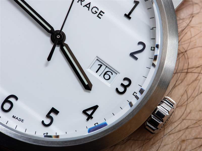在設計方面,表殼并沒有太努力,但它確實有一些有趣的線條和視覺技巧,使它脫穎而出,不像另一只圓形包豪斯風格的手表。我真的很喜歡突出而清晰的黑色涂層金屬指針,它與這個版本的 Omnium 蛋殼白表盤形成鮮明對比。就其個性而言,小時標記有點“掛鐘”,但整體表盤非常易于閱讀且制作精美。