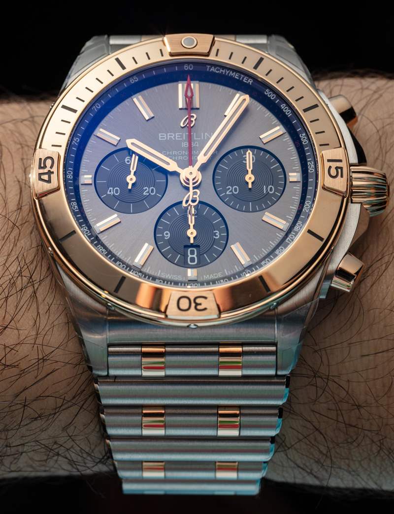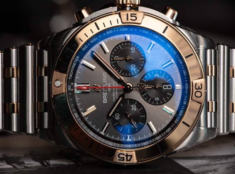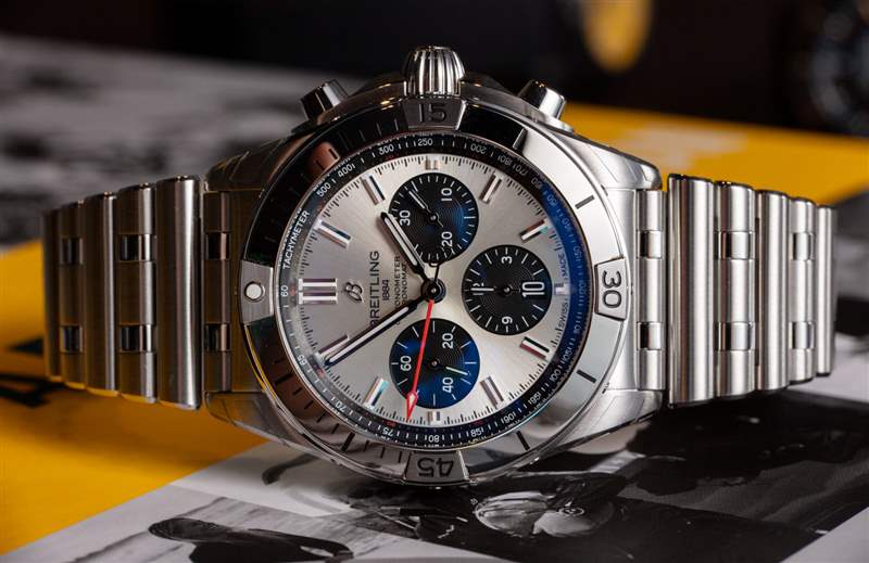 包括百年靈在內(nèi)的許多品牌都對(duì)更新的老式“熱狗棒”式時(shí)針和分針感到高興,讓它們感覺(jué)更加現(xiàn)代和棱角分明。同樣,新款 Chronomat 的指針采用復(fù)古 Chronomat 手表的形狀,并根據(jù)當(dāng)今的品味進(jìn)行渲染。Chronomat 腕表的三倍數(shù)陣列計(jì)時(shí)表盤(pán)非常精致優(yōu)雅,展現(xiàn)出當(dāng)今百年靈所鐘愛(ài)的一種簡(jiǎn)約保守主義。表盤(pán)體驗(yàn)之所以奏效,是因?yàn)槭煜さ耐庥^以及對(duì)顏色和材料的良好使用。百年靈在這方面并沒(méi)有太多創(chuàng)新,但我認(rèn)為表盤(pán)不會(huì)讓任何人感覺(jué)到“那是一塊漂亮的手表”。