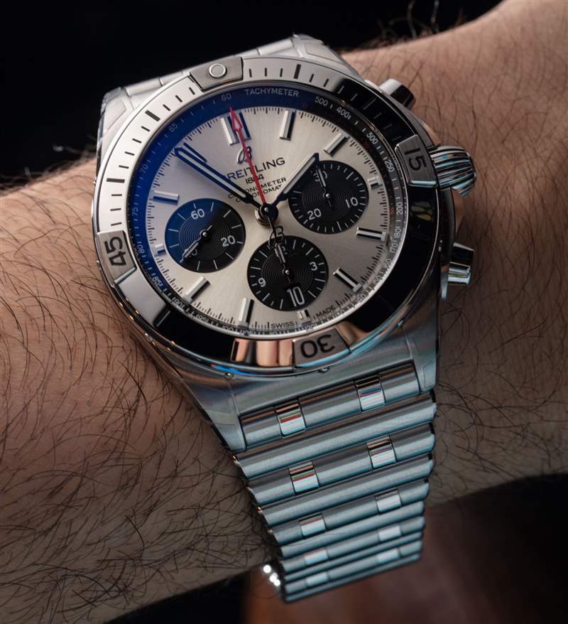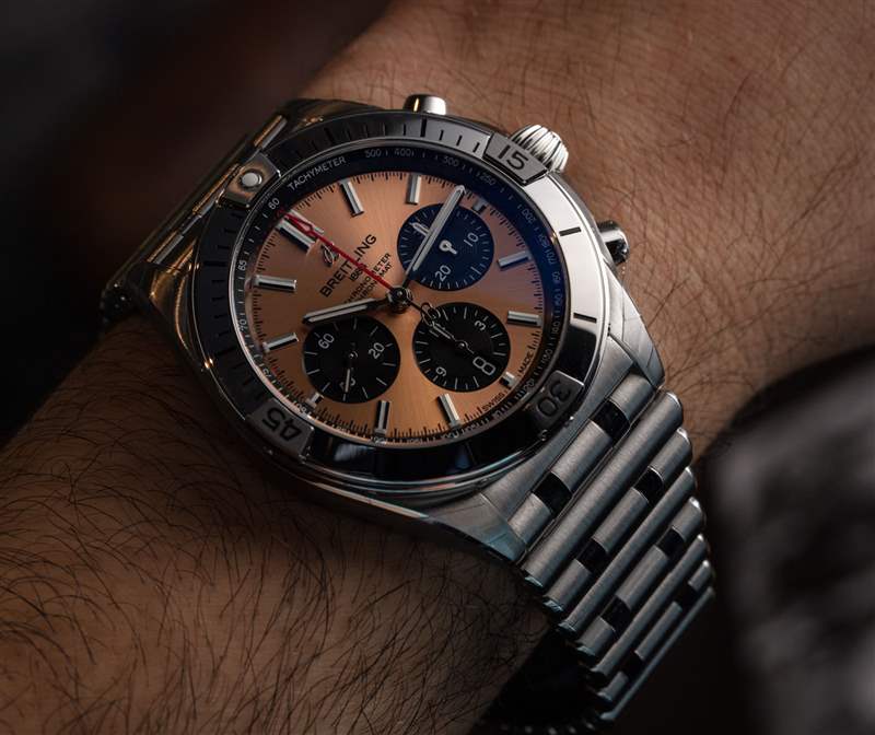 百年靈現(xiàn)在也有一款手表,至少在外觀上可以在“集成表鏈?zhǔn)袌?chǎng)的鋼表”中競(jìng)爭(zhēng)。對(duì)我來(lái)說(shuō),這是 Chronomat B01 42 發(fā)揮的最佳技巧,因?yàn)閭鹘y(tǒng)上它并不被認(rèn)為是適合這種風(fēng)格的手表 – 現(xiàn)在它確實(shí)如此。從結(jié)構(gòu)的角度來(lái)看,這款新手鏈與幾十年前的傳統(tǒng) Rouleaux 手鏈完全不同。這些新產(chǎn)品的制造更像是當(dāng)代奢侈品,其零件經(jīng)過(guò)單獨(dú)加工和拋光,通常使用更堅(jiān)固的金屬片。Old Rouleaux 手鏈會(huì)隨著時(shí)間的推移而彎曲和伸展。隨著時(shí)間的推移,這款手鐲似乎不會(huì)出現(xiàn)任何這種類型的磨損。手鏈的新鮮形式很重要。很舒服是的,但更重要的是它突出并有助于佩戴 Chronomat B01 42 的體驗(yàn)更加與眾不同。對(duì)于許多消費(fèi)者而言,這只會(huì)有助于提高手表的價(jià)值,因?yàn)槿藗儾幌M谶@些價(jià)位上獲得普通的奢侈手表體驗(yàn)。