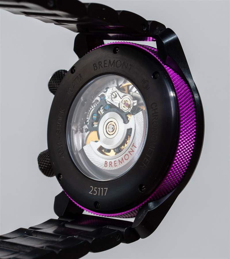 我一直是 Bremont 的 MBII 案子的粉絲。表殼本身的設(shè)計(jì)非常優(yōu)雅,我喜歡它使用特別硬化的鋼。布雷蒙特也碰巧制作了自己的案例。您可以配置帶或不帶顯示底蓋的 MBII 手表。沒有它,你就有了一個(gè)更完整的軟鐵芯來保護(hù)手表免受磁場(chǎng)的影響。這些表款采用“硬幣式”底蓋,帶有品牌著名的“Tested Beyond Endurance”口號(hào)(最初源于 Martin-Baker 的關(guān)系)。然而,很難抗拒展示底蓋,因?yàn)闄C(jī)芯及其 Bremont 內(nèi)部修改看起來很酷。更多關(guān)于下面的內(nèi)容。