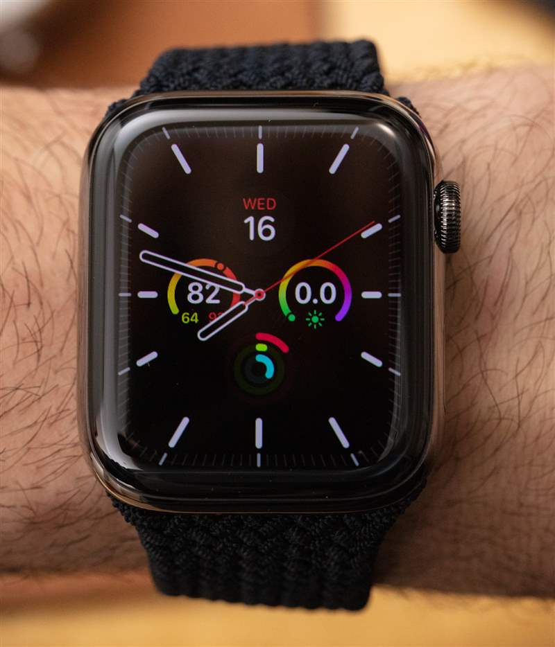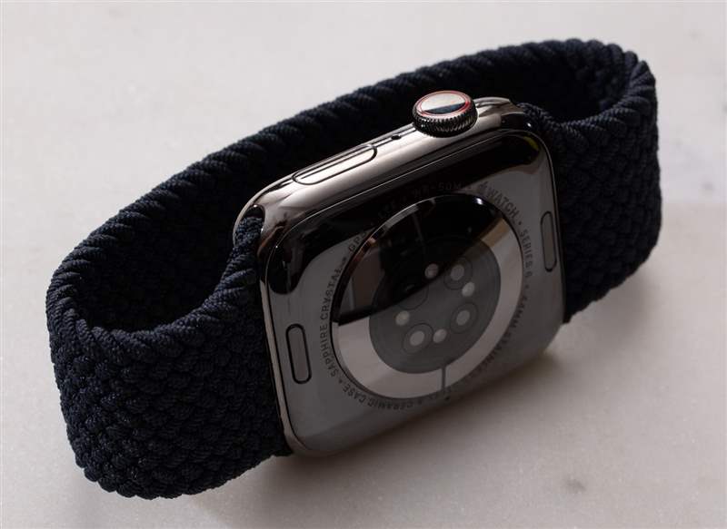 我手腕上的那個是 44 毫米長的鋼制版本,帶有“石墨黑”拋光涂層。它的防水深度為 50 米,屏幕上方有藍寶石水晶,表殼后部的 LED 上方還有額外的藍寶石水晶。盡管擁有更多功能和更亮的屏幕,但電池壽命仍然“全天”。我在 Apple 新的 Braided Solo Loop 表帶上佩戴了 Series 6 鋼,這是 Apple Watch 現在提供的兩種新的“彈力”表帶樣式的一部分。這些讓我回到曾經非常流行的Speidel Twist-O-Flex 肩帶我記得在 1980 年代一直看到。這些帶子不需要在手腕上調整大小或閉合;它們只是展開以適合您的拳頭和手腕。你如何調整它們的大小?你沒有。Apple 為 Solo Loops 表帶出售一長串尺寸(其中超過 10 種),因此您需要提前量好手腕才能獲得一個(或者在可能的情況下在 Apple Store 商店嘗試各種尺寸)。
