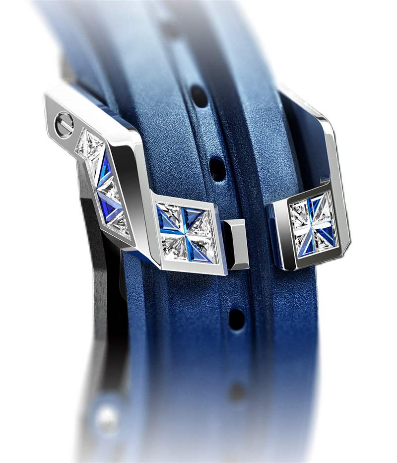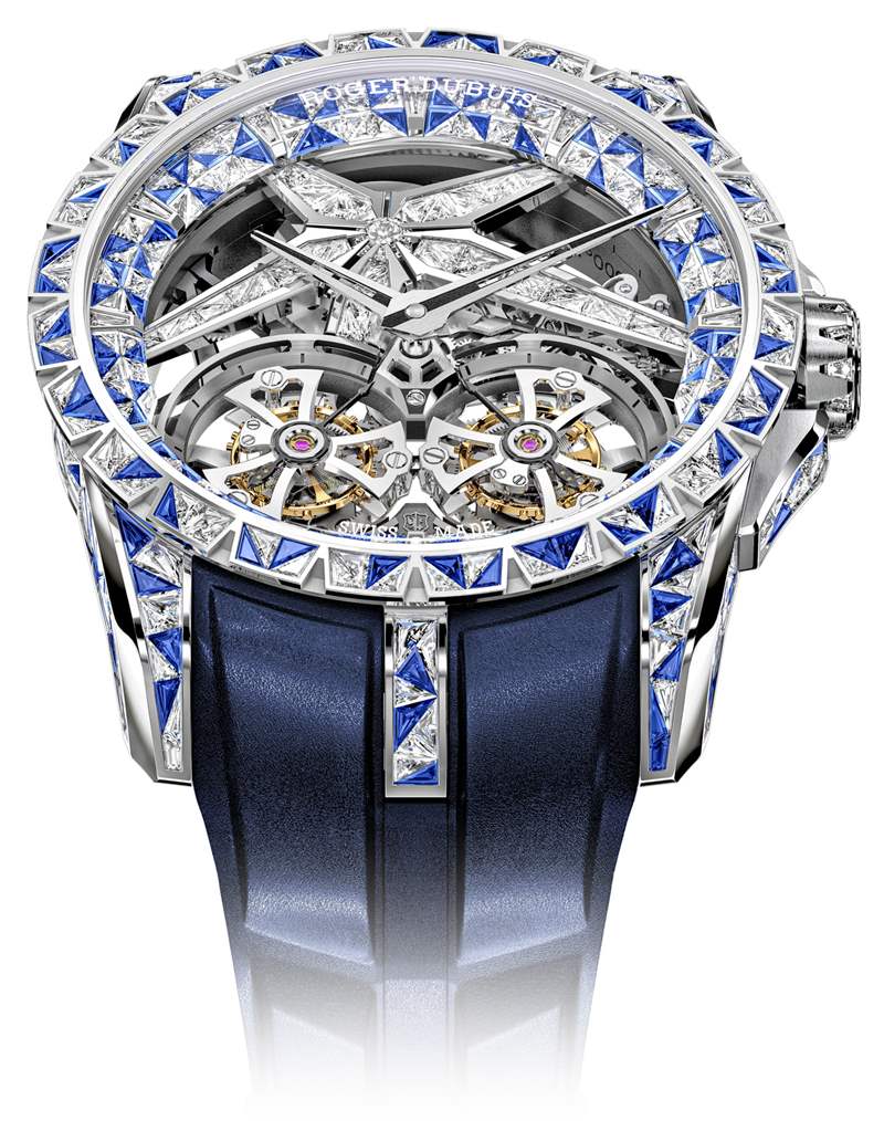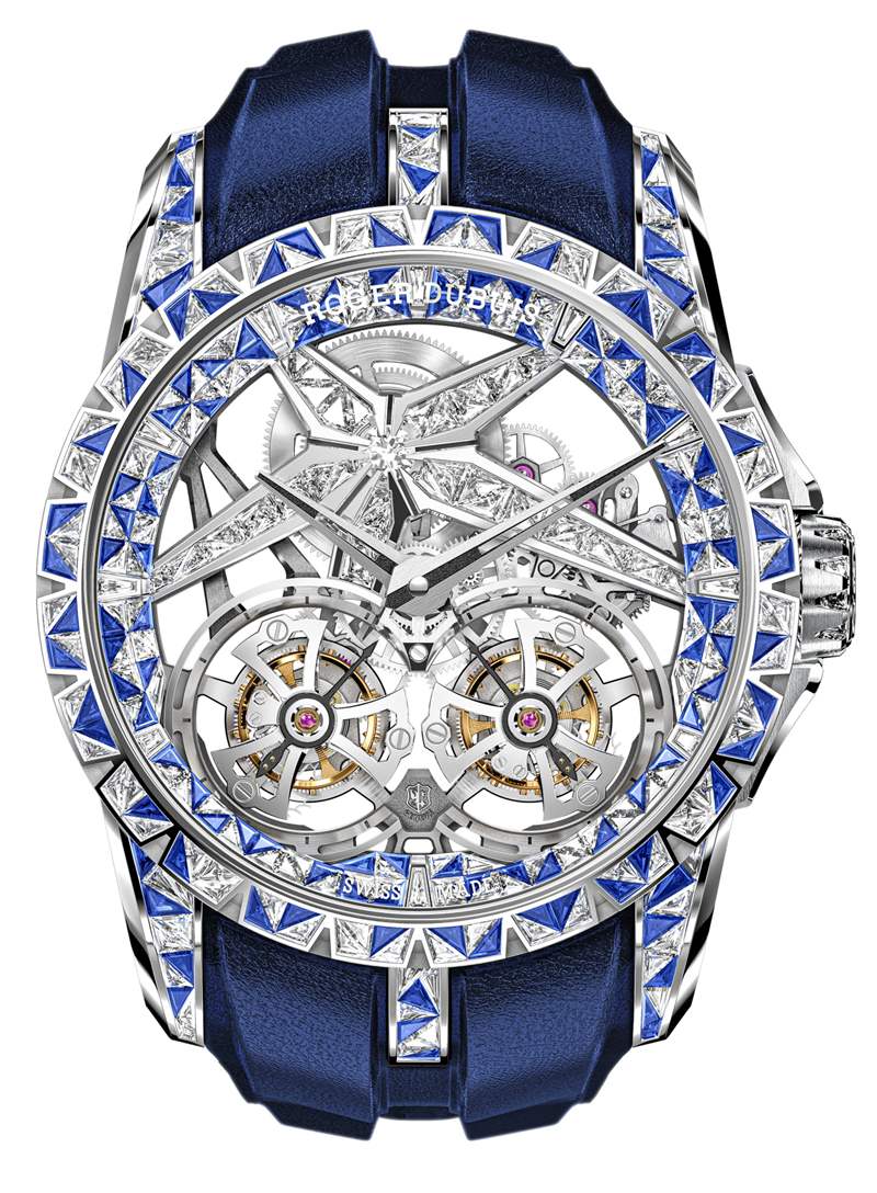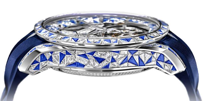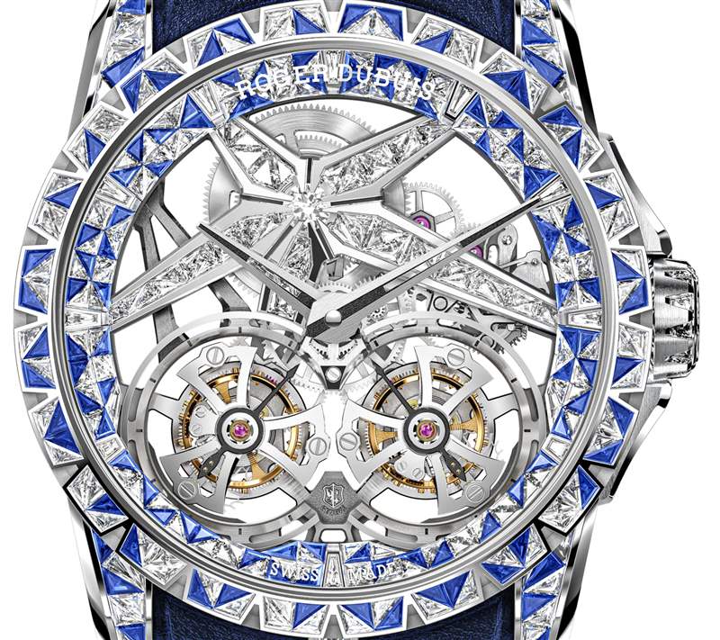 Excaliber Superbia 腕表寬 45 毫米(14.4 毫米厚,??防水深度達(dá) 100 米),采用 18k 白金 Excalibur 風(fēng)格表殼,交替鑲嵌四面體切割鉆石和深藍(lán)色藍(lán)寶石。腕表內(nèi)鑲嵌了 600 顆鉆石和藍(lán)寶石。Roger Dubuis 公開(kāi)將手表描述為“相信生活不過(guò)是充分利用他人的游戲的一群人的終極圖騰”——換句話(huà)說(shuō),那些成功地(并且經(jīng)常令人震驚地)剝削他人的人。是的,當(dāng)這些人很容易被標(biāo)記時(shí),它會(huì)很有幫助——比如使用獨(dú)一無(wú)二的藍(lán)色和白色閃閃發(fā)光的鐘表。羅杰杜彼通過(guò)幫助識(shí)別感興趣的人來(lái)幫助進(jìn)步的努力。看,在像瑞士這樣以公平為重點(diǎn)的社會(huì)中,每個(gè)人都會(huì)獲勝。