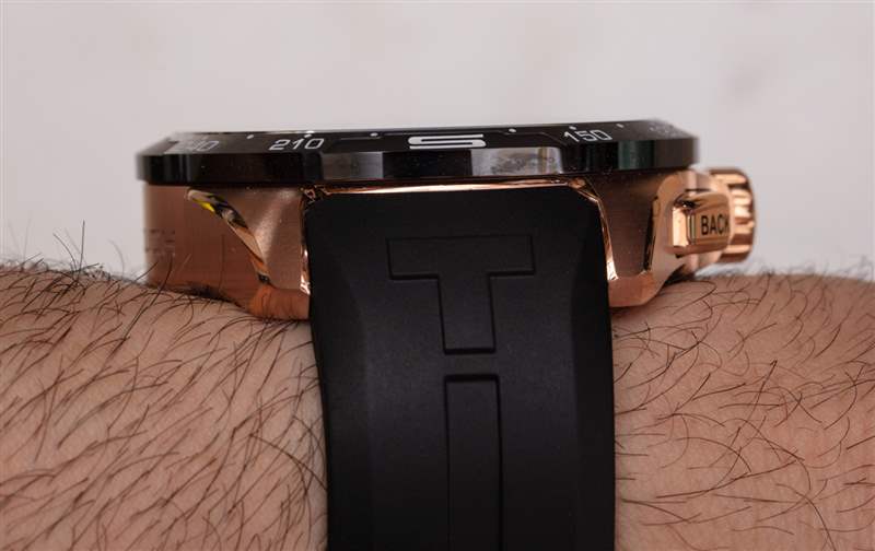 T-Touch Connect Solar 是一款戴在手腕上的大型手表,但佩戴起來非常舒適,尤其是在舒適的橡膠表帶上。這款手表也比你想象的要輕,因為鈦金屬表殼是 PVD ??涂層,帶有玫瑰金色調(diào)。擋板采用黑色陶瓷制成(帶有發(fā)光的導航標記)——這很重要,這樣它正下方的天線就可以接收信號。即使設計略有老化,T-Touch 表殼(尤其是表鏈上的表殼)也為現(xiàn)代互聯(lián)時計提供了出色的基礎。廣告訊息廣告信息結束