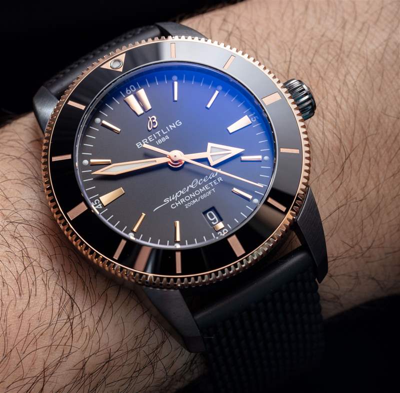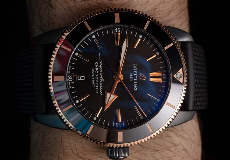在風格方面,手表的大部分清醒的黑色調被 18k 紅金優雅地溫暖,這將原本是一款嚴肅的運動手表帶入了奢華風格的領域。在很多方面,這款比佛利山莊限量版 Superocean Heritage II 44 是一款非常“洛杉磯手表”,因為它注重陽剛的外觀和尺寸,但也有一些不可否認的浮華。那些喜歡黑色和玫瑰金/紅金的人肯定會發現這款百年靈手表很適合他們的風格——而且它是日常佩戴的好選擇。我想說許多額外的表帶選擇可能有助于進一步改變這款手表的個性。