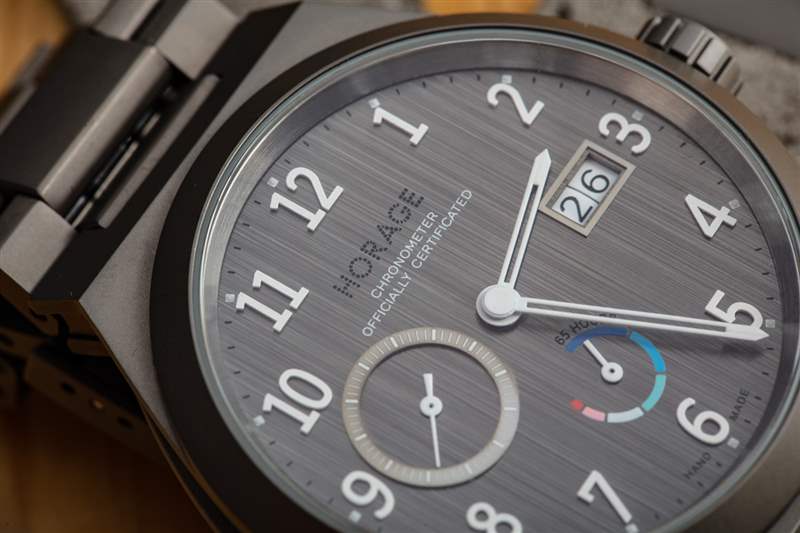 Horage 生產(chǎn)的標準 Autark 模型在某些方面與“10 年限量版”有些不同。表圈完全光滑,而不是被切割成小凹口。鈦金屬表殼經(jīng)過硬化和噴砂處理,而不是拉絲處理。表盤本身也不同——經(jīng)過拉絲處理,然后賦予深灰色無煙煤色調(diào),與應用的白色阿拉伯小時數(shù)字和相配的白色指針形成鮮明對比。