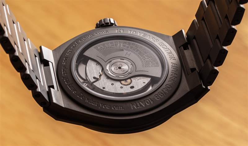 表盤上方是平坦的 AR 涂層藍寶石水晶鏡面,不會產(chǎn)生眩光問題。手表后部的另一個水晶提供了運動的視圖 – 轉子和主橋也進行了無煙煤處理。自動轉子本身有一些非常小的雕刻,應該用 19 種不同的語言寫著“10 年”。這讓我想起了我們經(jīng)常在一些高珀富斯手表上找到的文字。自動轉子本身是鎢制的。為什么?就重量而言,大多數(shù)情況下,鎢比鉑更便宜。轉子越重,手表上鏈的效率就越高。我想報告說,在佩戴 Autark 時,我發(fā)現(xiàn) K1 機芯確實非常有效地上鏈(意思是快速上鏈),我一直關注的彩色動力儲存指示器證明了這一點。