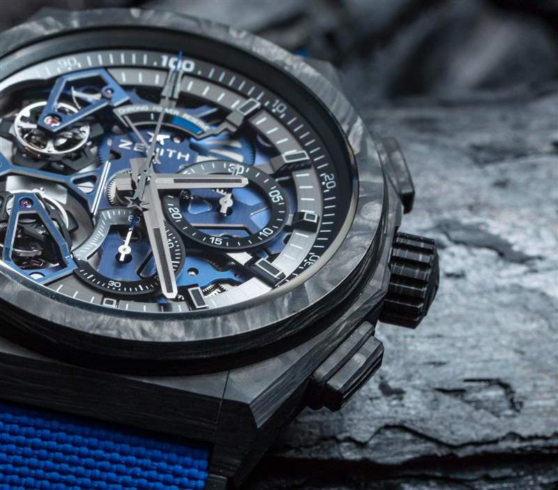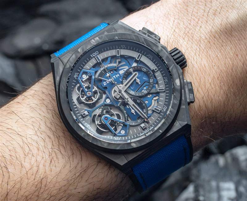 Defy 系列或多或少是真力時對大爆炸的回應,但添加了一點經典融合。它現代而陽剛,但比宇舶表更微妙。這款特別的 Zenith Defy El Primero 雙陀飛輪腕表寬 46 毫米,表殼由碳制成——在超豪華時計領域是一種輕巧且非常時尚的材料。表殼防水深度達 100 米,表殼前后均配有藍寶石水晶。附在表帶上的是一條舒適的橡膠表帶,外部帶有藍色“cordura 織物效果”橡膠襯里。黑色展開式表扣由鈦制成。廣告訊息廣告信息結束
