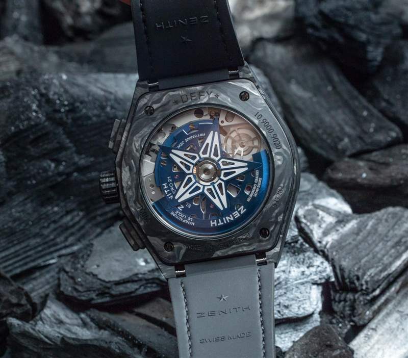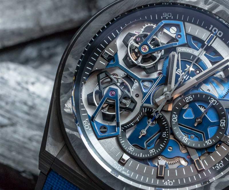 50Hz 足以讓 Zenith(以及之前的 TAG Heuer)聲稱計時碼表精度為 1/100 秒。在數字計時設備的世界中,這并不是特別奇妙 – 但如果您存在于機械計時的環境中,那就是。9020 自動機芯本身采用新的“Defy 風格”設計,這是該型號的當前系列。機芯橋板的藍色調與表盤和表殼的黑色調相得益彰,為這款腕表的“彪悍”增添了色彩。