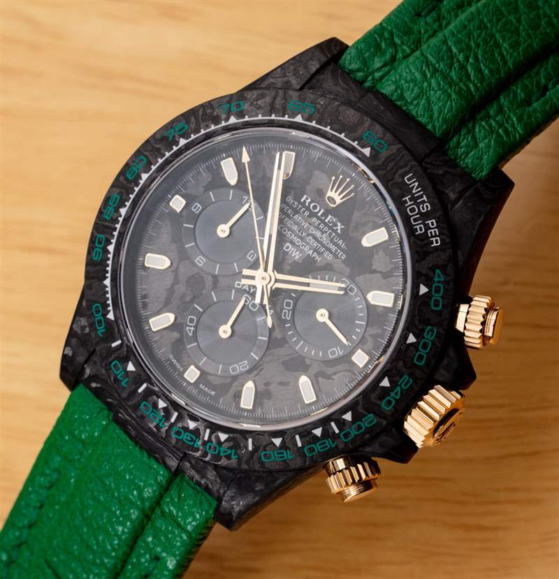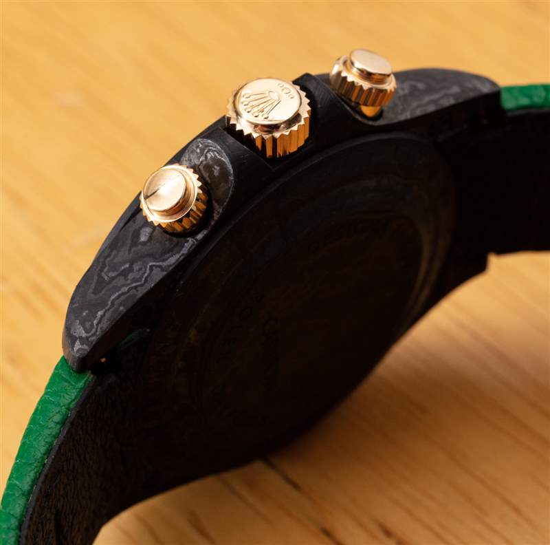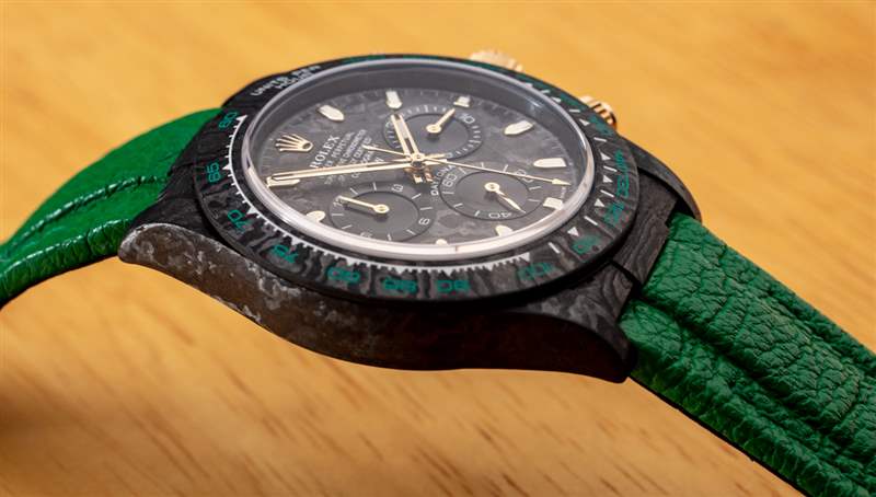 這一切都讓我親身體驗了一家名為 Designa Individual 的公司的售后市場改裝勞力士蠔式恒動宇宙計型迪通拿,該公司將其稱為“碳翡翠”。這是我處理過的許多售后勞力士手表之一。然而,這是我第一次看到全碳外殼。該公司對碳表殼的精確切割感到非常自豪,它具有優雅的質感,與金屬代托納手表相比非常輕巧。Designa Individual 似乎有點像 Richard Mille 的主題,但采用的是定制的 Daytona。它很有效,18k 黃金、黑碳和綠色表帶的組合營造出非常有靈感的外觀。請注意,Designa Individual 提供少量限量版勞力士迪通拿,帶有碳纖維表殼和綠色以外的顏色(和表帶)。碳翡翠是,