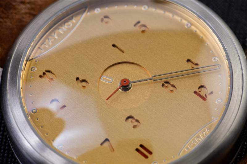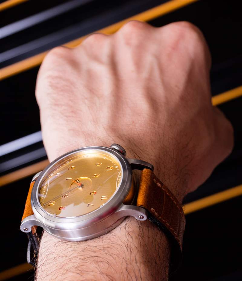 Itay Noy 目前生產三個版本的 ReOrder 手表,除了這個整潔的金色表盤版本外,還包括一個白色和藍色表盤。我相信白色表盤 ReOrder 可能是最清晰易讀的,但金色表盤搭配拉絲精鋼表殼和淺棕色皮革表帶確實在視覺上對我說話。易讀性并不完全是 ReOrder 的強項——這也許并不完全令人驚訝。表盤比例正確,但在這款金色表款上,鏤空分針或時標下方的紅色部分并不容易一目了然。事實上,一開始,骨架式手的整個用法讓我感到困惑。我的意思是我明白,從藝術上講,它們與小時標記窗口一起使用,但表盤上最清晰的指針(小秒針)真的很小,而且,