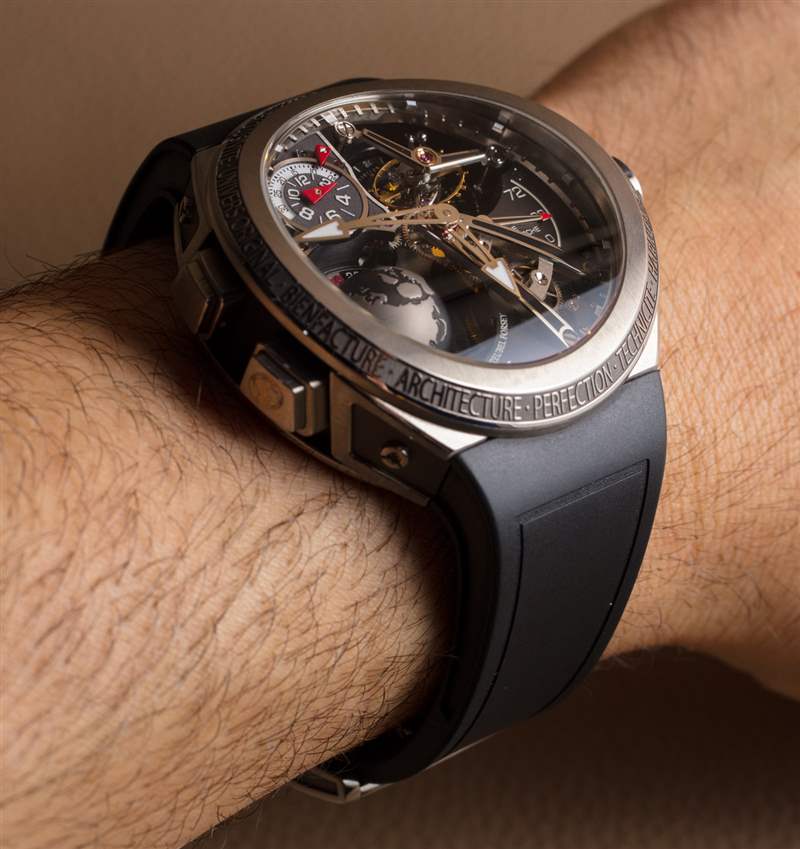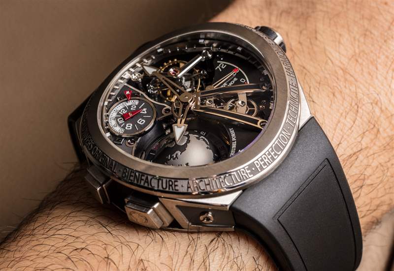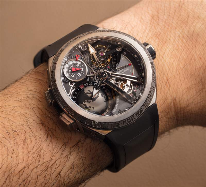 在手腕上,Greubel Forsey GMT Sport 非常舒適——這對(duì)于經(jīng)常制造舒適手表的品牌來(lái)說(shuō)并不令人意外(盡管他們的許多手表都具有高度原創(chuàng)的表殼形狀)。在定制的橡膠表帶上(其設(shè)計(jì)看起來(lái)好像與表殼融為一體),與其他高珀富斯手表不同,GMT Sport 具有手腕存在感。雖然它在手腕上很高,但我確實(shí)認(rèn)為,對(duì)于合適的人來(lái)說(shuō),這款手表可以成為日常佩戴。