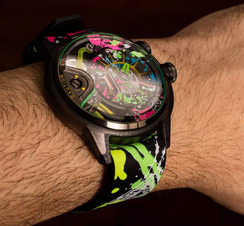 我敢肯定,稍后會詳細介紹高端石英的未來。現在讓我們回到 ELECTRICIANZ Neon Z。外殼尺寸更大,為 45 毫米,帶有鋼質內芯和半透明煙熏尼龍材料外殼。表面定制形狀的水晶采用 K1 礦物水晶制成,帶有霓虹綠色墊圈,使邊緣呈現出發光的綠色外觀。電池穩定器也呈霓虹綠色,表盤與北約風格的表帶一起,被賦予了霓虹噴漆風格的藝術處理。在 1980 年代末和 1990 年代初流行的那種明亮的顏色(我記得很清楚)現在顯然又回來了。我一直認為它很酷(盡管并不總是很有品味,具體取決于上下文)并且很高興看到這樣的美學調色板。我也一直在說“顏色是新的黃金,廣告訊息廣告信息結束