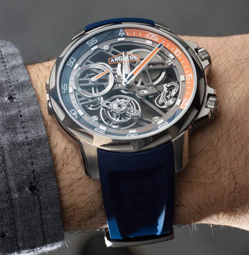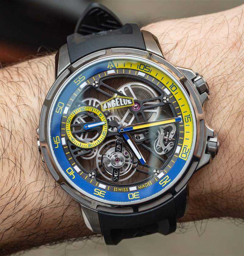 正如我上面提到的,Angelus U51 Tourbillon Diver 是由真正的手表愛好者和收藏家設計的。這意味著,至少,手表需要舒適且可穿戴——而且確實如此。在過去的日子里,像 Angelus U51(主題)這樣的東西不僅會貴得多,而且從人體工程學的角度來說,通常也無法佩戴。45 毫米寬的 5 級鈦金屬表殼在手腕上具有驚人的纖細感覺(約 12.5 毫米厚),并且可以緊緊地包裹在您的手臂上。搭配橡膠表帶,這款相對輕巧的腕式腕表佩戴起來令人愉悅,但佩戴者將不得不向許多旁觀者解釋他們選擇的腕表。廣告訊息廣告信息結束