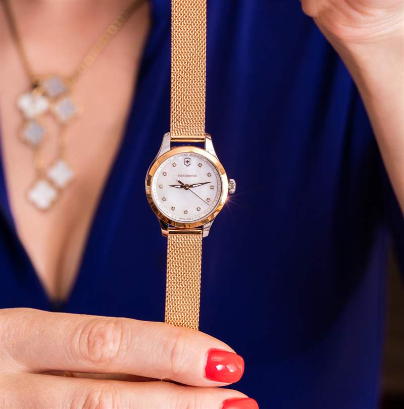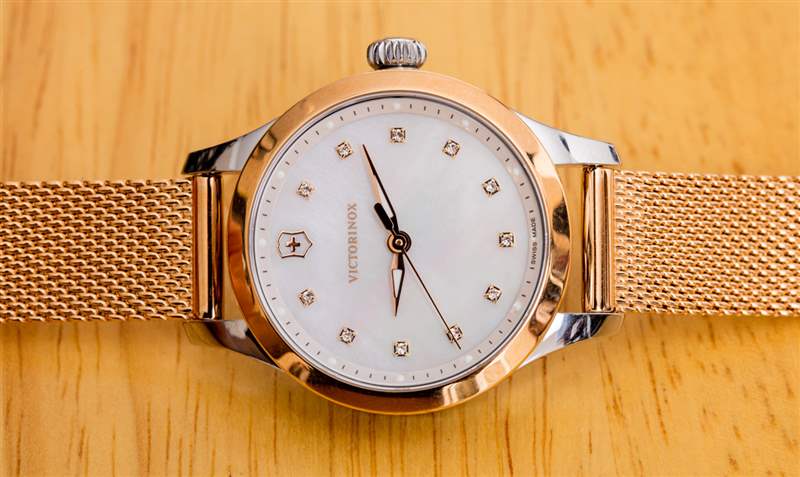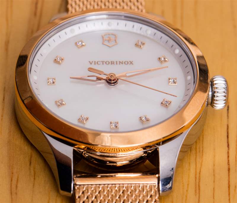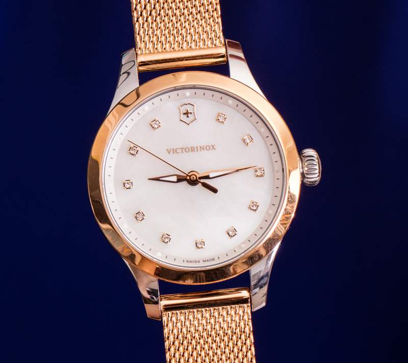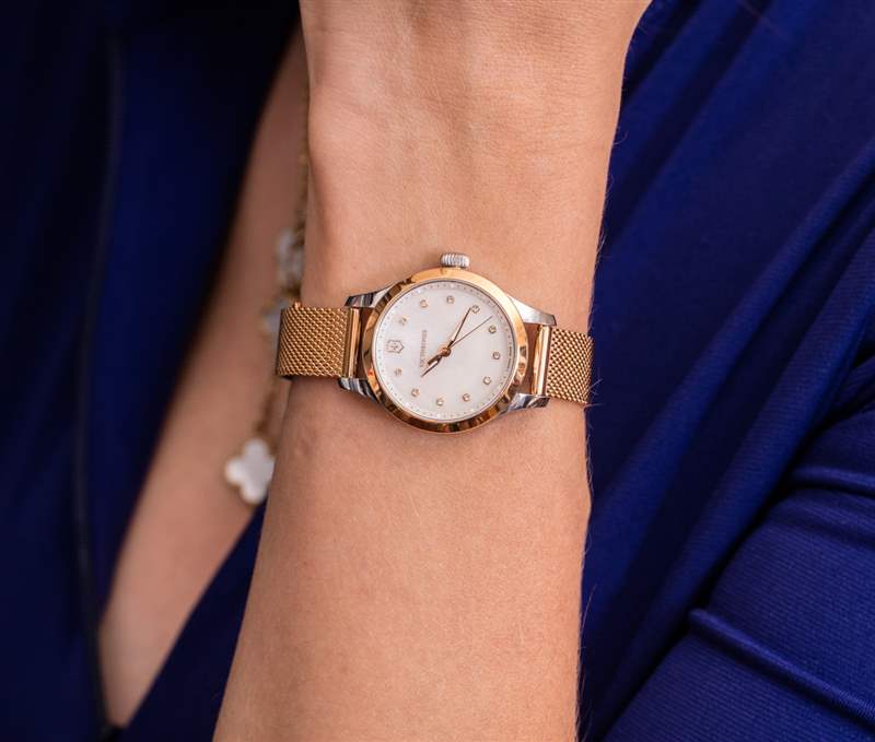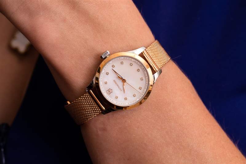 如果我以銷售員的身份坐在手表店里,想要擁護 Victorinox 這一特定系列的女士手表的優點,我可能會說這是為那些仍然希望世界發現她有吸引力的實用女性而設計的。關于這款來自傳統“工具表”制造商的 28 毫米寬閃亮女式手表,我首先注意到的一件事是每個小時刻度處的珍珠母和小施華洛世奇水晶的裝飾性裝飾。Victorinox 對漂亮的女士手表并不陌生,但很少,如果有的話,他們以前的系列會深入研究“金光閃閃”。進入似乎對年輕買家的關注感興趣的 Victorinox,以及似乎從鐘表選擇開始的女性(盡管作為一個男人,我承認沒有研究過該品牌目前可能提供的最新女性時尚或行李箱選擇)。