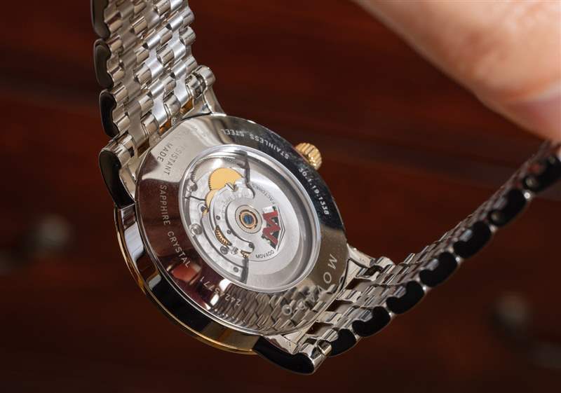 摩凡陀采用更高級的精工級機(jī)芯,裝飾精美,并配有定制的摩凡陀“red M”自動擺陀。機(jī)芯以 4Hz 頻率運(yùn)行,動力儲存約兩天。使用自動機(jī)芯真的是為了吸引像我這樣的手表愛好者。鑒于表盤只有時(shí)針和分針,您甚至看不到運(yùn)行秒針。因此,佩戴者非常重視自動機(jī)芯的價(jià)值——但對于鐘表愛好者級產(chǎn)品而言,這絕不是罕見的。