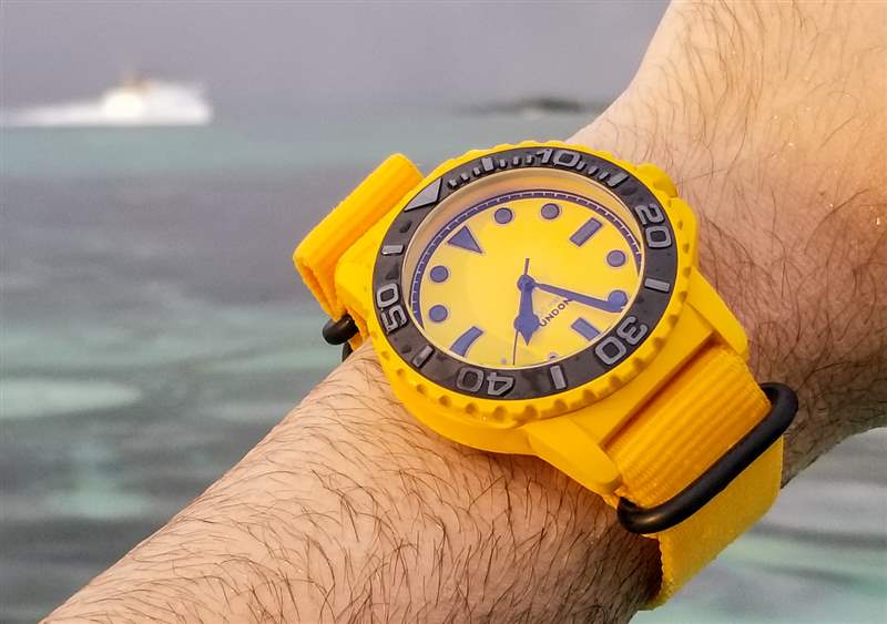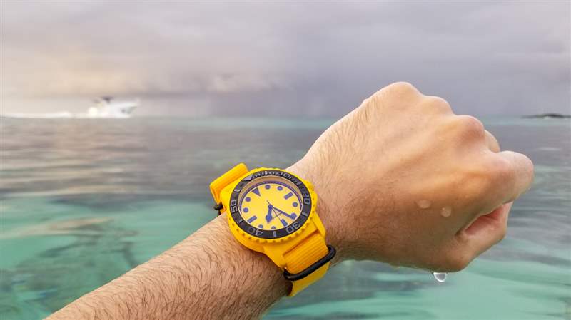 佩戴 Aqua BLK + YLW 是一種有趣的體驗(yàn),因?yàn)槟_始注意到周圍的黑色和黃色的一切。黑色和黃色代表巴哈馬國旗顏色的三分之二(在拿騷周圍的藍(lán)綠色海水中,它成為國旗)。無數(shù)黑色和黃色的魚在水中游動,你會發(fā)現(xiàn)很多潛水設(shè)備也是黑色和黃色的。島嶼周圍也有數(shù)量驚人的服裝和比基尼組合,具有相同的配色理念。我敢打賭,在世界不同地區(qū),這款和未來的 BLK + YLW 手表將呈現(xiàn)出各種身份。
