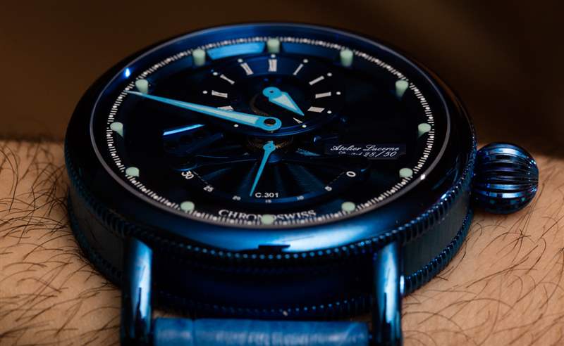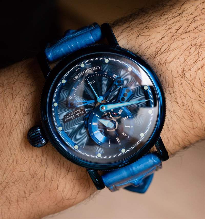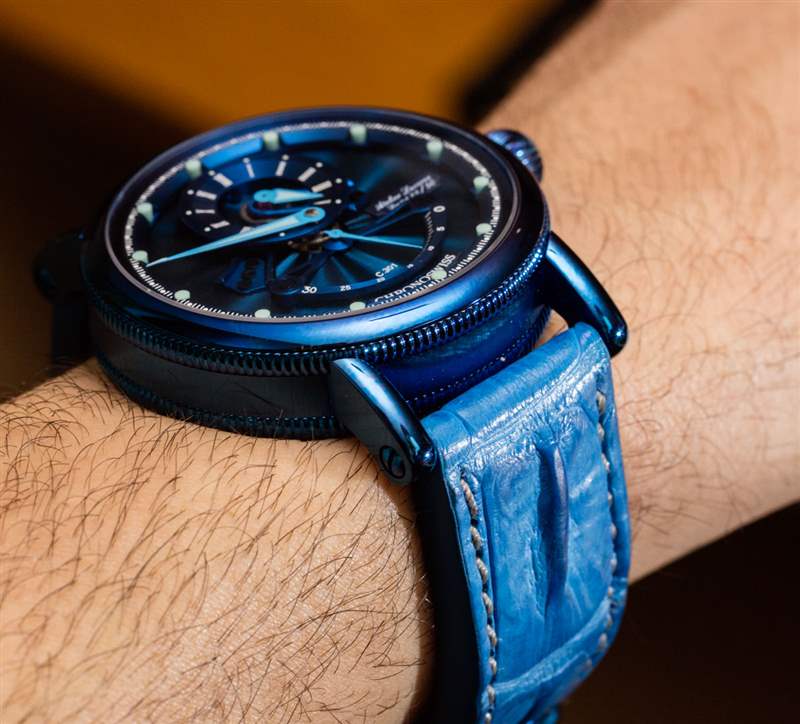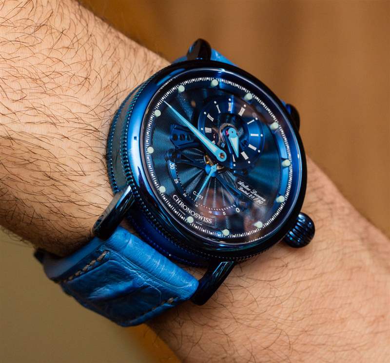 正如我上面提到的,“ReSec”是 Chronoswiss 的“逆行秒”的簡稱。有時您可能會看到這款手表的(深呼吸)更長的全名,即“Chronoswiss Flying Grand Regulator Open Gear Retrograde Seconds”。現在你知道我為什么告訴 Chronoswiss,“只要把這個特殊的模型稱為 Blue Note。” 聽起來不是更好嗎?藍色本身很醒目,在表殼上,它以藍色 DLC 涂層的形式出現在基礎鋼層上。Chronoswiss 將表殼搭配藍色 Hornback 鱷魚皮表帶,以及藍色表盤和藍色指針。這可能是今年最藍的手表!