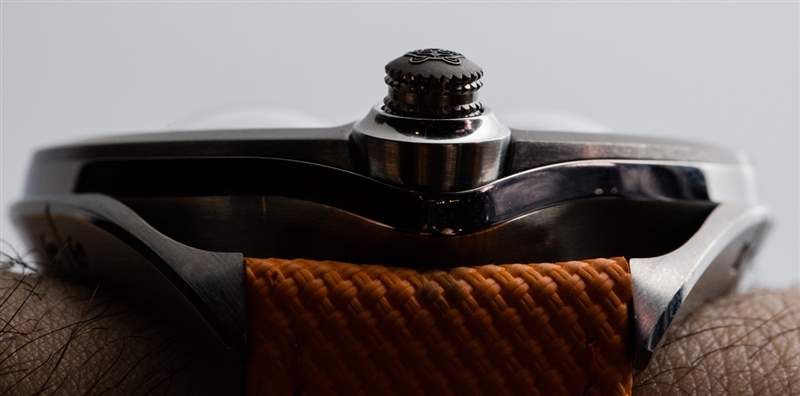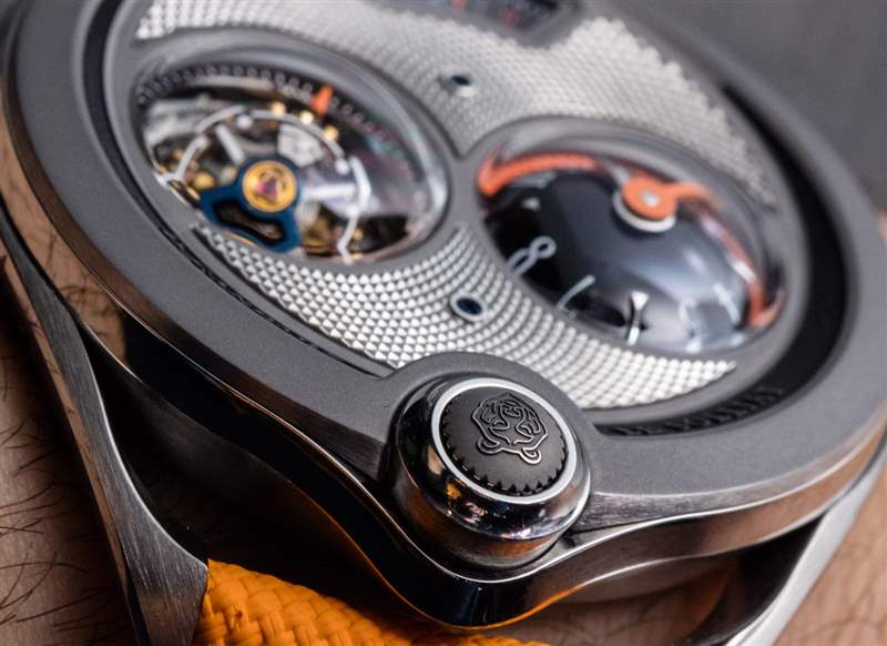 從視覺上看,DC 6 Solstice Half Hunter 看起來就像一張盯著你看的科幻臉?;蛘叻蓝久婢?,或者蒼蠅,或者蚊子,取決于你的觀點。兩個相對的表盤看起來像眼睛,上面覆蓋著高度圓頂的藍寶石水晶。臉的“嘴”實際上是表冠,這是 DC 系列手表的獨特元素之一,被 Candaux 稱為“神奇的王冠”。DC 1 和 DC 6 系列手表沒有像我們在大多數其他手表中發現的那樣在表殼側面有一個固定的表冠,而是有一個表冠,當你按下它時它就會松開。將表冠從其“內部位置”松開后,即可正常拉出以設置時間。我所熟悉的唯一一款具有類似表冠概念的時計是香奈兒 J12 逆行神秘陀飛輪.?DC 6 表冠系統本身由 31 個零件組成,并使用由三個墊圈組成的復雜系列來保持腕表的防水性能。