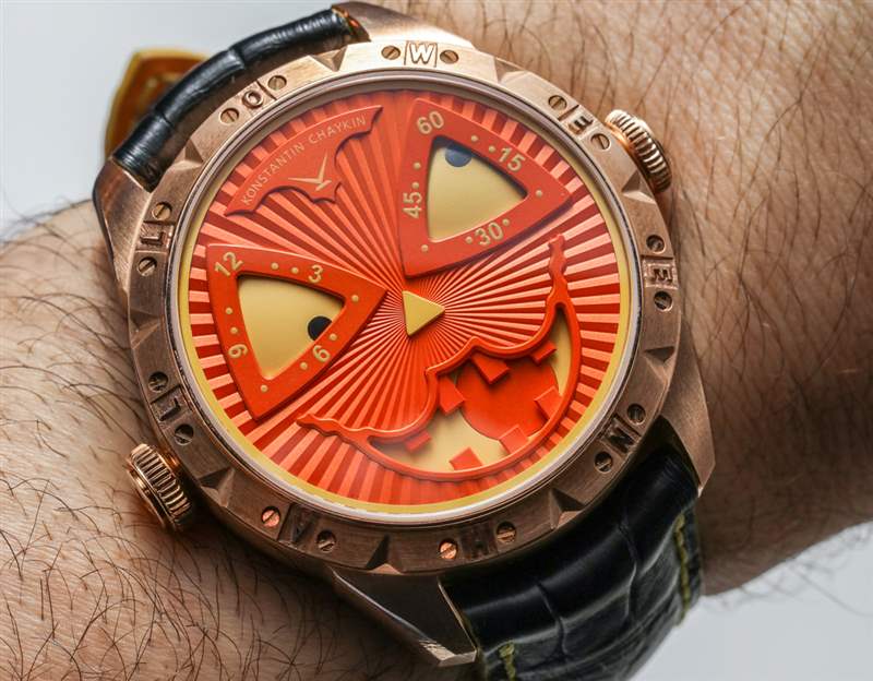 對于這個版本的小丑,Konstantin Chaykin 決定用青銅制作萬圣節——這應該會很有趣。表殼寬 42 毫米,厚 13.7 毫米。表盤上方是 AR 涂層藍寶石水晶。“萬圣節”也拼寫在整個表圈周圍。