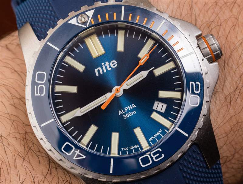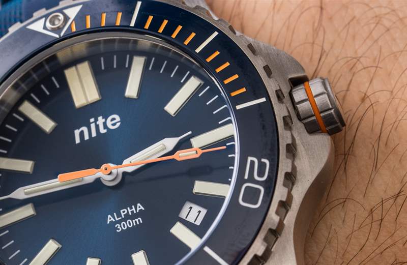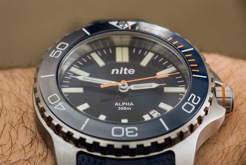 作為潛水員風(fēng)格的手表,Alpha 防水深度達(dá) 300m,并具有 AR 涂層(根據(jù) Nite 為三層)藍(lán)寶石水晶。另一個非常好的功能是在單向旋轉(zhuǎn)表圈中使用了藍(lán)色陶瓷嵌件。還要注意使用氚氣管作為表圈上 60 分鐘標(biāo)記處的 lume pip。手表內(nèi)部是瑞士朗達(dá) 715Li 石英機(jī)芯,“Li”代表鋰離子,意味著該機(jī)芯具有 10 年的電池壽命。