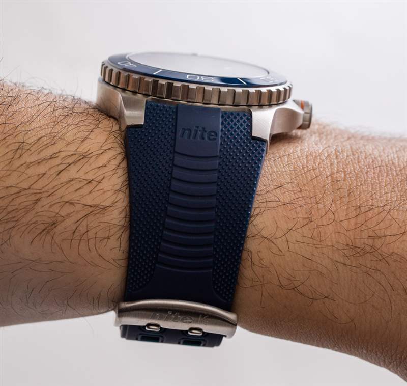 暫時回到隨附的表帶,我想提一下 Nite 使用了更“安全”的兩爪式搭扣以及兩個小標(biāo)簽,有助于將多余的表帶固定在表帶環(huán)中。如果沒有這個功能,光滑紋理的聚合物表帶可能會掉出環(huán)——而橡膠表帶增加的表面摩擦力并沒有這個問題。我很欣賞 Nite 確保根據(jù)使用的材料正確設(shè)計表帶。