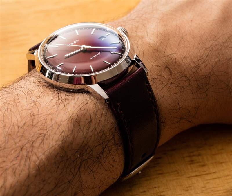 附在表殼上的是一條 20 毫米寬的皮革表帶,根據表盤和表殼顏色有四種色調之一。表帶做工很好,戴在手腕上感覺既柔軟又柔軟。與價格相近的日本正裝手表的表帶相比,天美時在皮革部門擊敗了它們。如上所述,Marlin Automatic 以四種款式首次亮相,包括天然和金色鋼表殼,以及銀色、黑色、深灰色和栗紅色表盤。手套顏色也不同,旨在與手表的其余部分搭配使用。Timex 位于米蘭的設計團隊在確保顏色和飾面恰到好處方面做得非常出色——這種價位的手表通常無法接受這項服務。