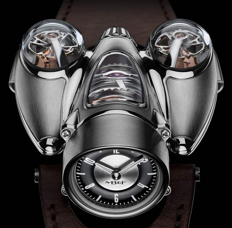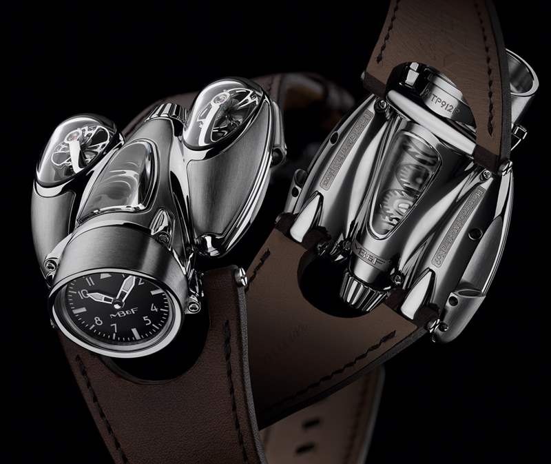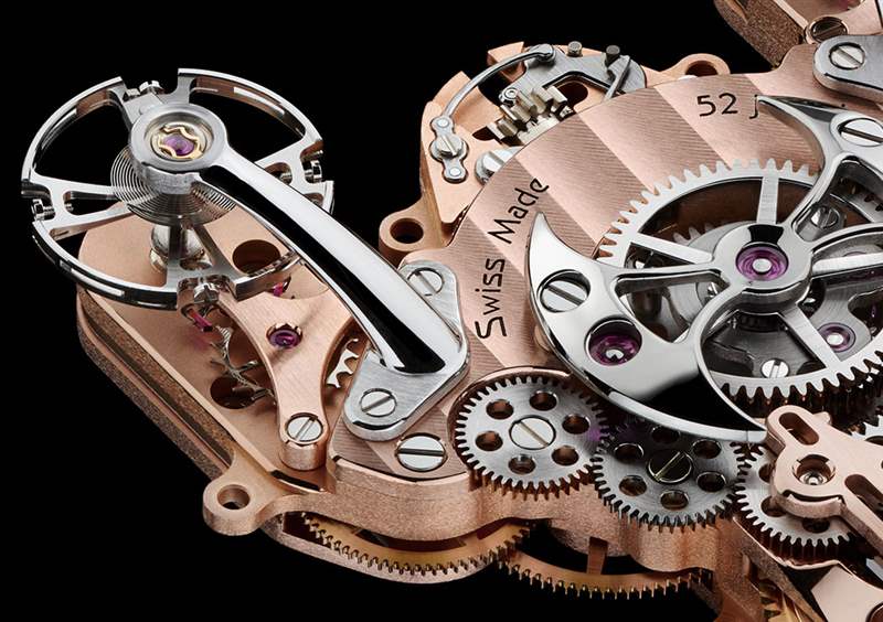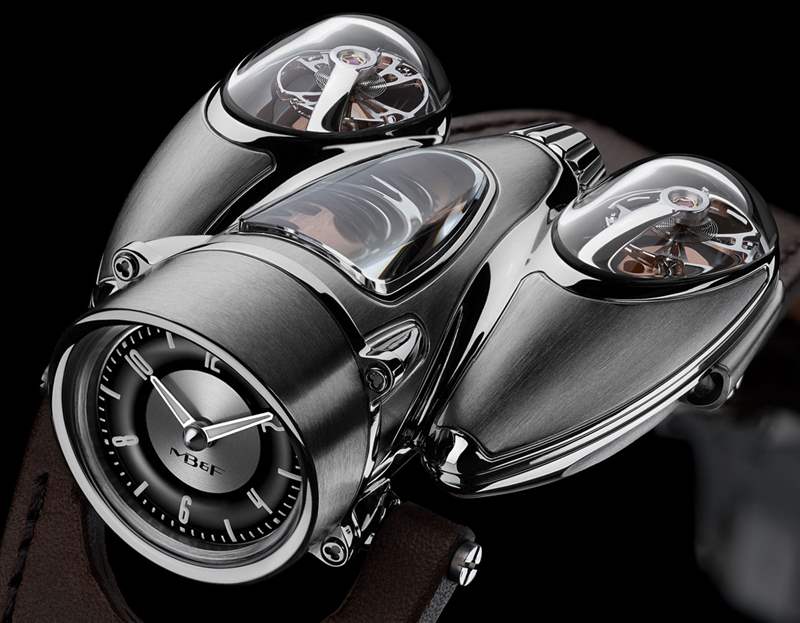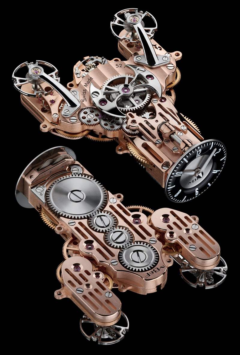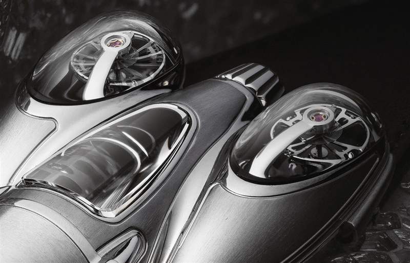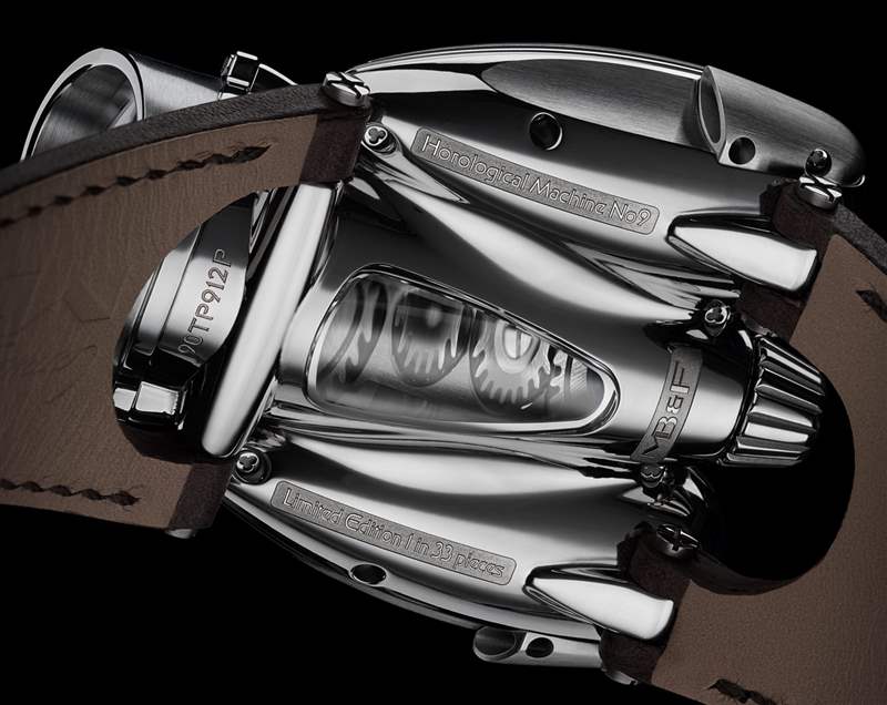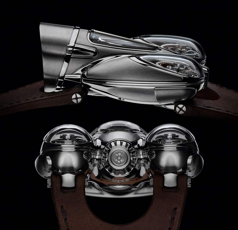 從鐘表上講,兩個平衡輪將通過差速器連接到同一個運行的火車上。每個調節機構的運行結果將被平均化——理論上可以提供更高的精度(假設手表一開始就被正確調節)。這比 MB&F 生產的其他類型的多擺輪手表(例如 Legacy Machine 2 )更簡單直接. 例如,LM2 手表是在兩個非常接近的平衡輪中進行的練習,可以在兩個平衡輪的工作頻率之間產生協調的“共振”效果。在 MB&F HM9 中,擺輪之間的距離太遠,以至于無法產生任何共振效應。正如我所說,它們的操作是獨立的,并且它們的計時結果被平均以顯示當前時間。