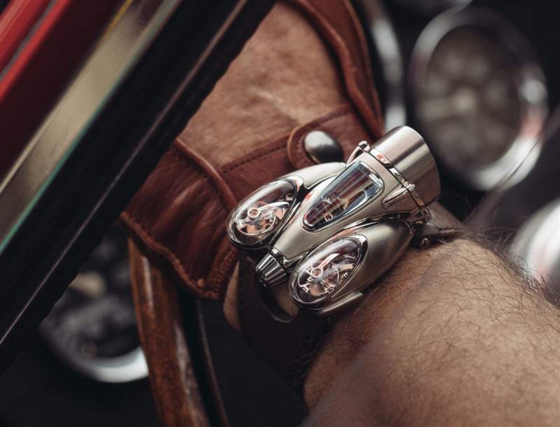 MB&F HM9 Flow 的弧形表殼靈感來自 1940 和 1950 年代為實現空氣動力學性能而設計的車輛。側面外殼的俯沖線條讓人想起風洞構思的機器及其外殼。MB&F 試圖吸引汽車和航空界的粉絲,因為 HM9 的每個版本的表盤都暗示了不同的主題。例如,MB&F HM9 Flow Air 有一個飛行員風格的手表表盤(和一個深色的機芯),而 MB&F HM9 Flow Road 的表盤靈感來自汽車速度計表盤,并有一個鍍玫瑰金的機芯.廣告訊息廣告信息結束