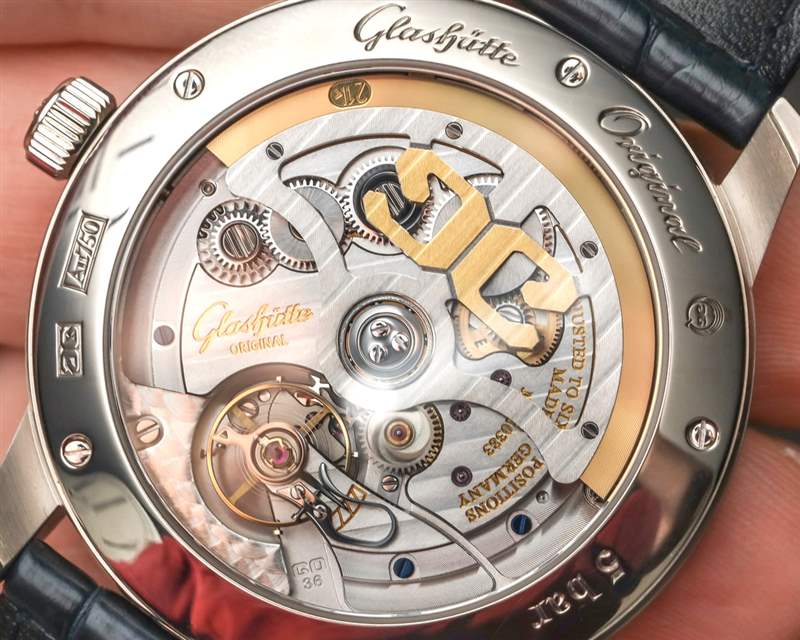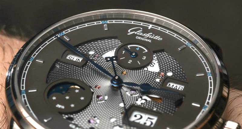格拉蘇蒂原創對表盤所做的是將中間部分打開,同時保留具有小時和分鐘刻度的外圈。此外,表盤上具有與日歷復雜功能相關的信息的五個區域中的每一個都連接到外圈。由于中間部分被切掉,所以說表盤(不是機芯)是鏤空的也沒有錯。Glashutte Original 格拉蘇蒂原創在機芯的頂板上刻上了迷人的機器扭索雕刻,為腕表增添了一層裝飾。